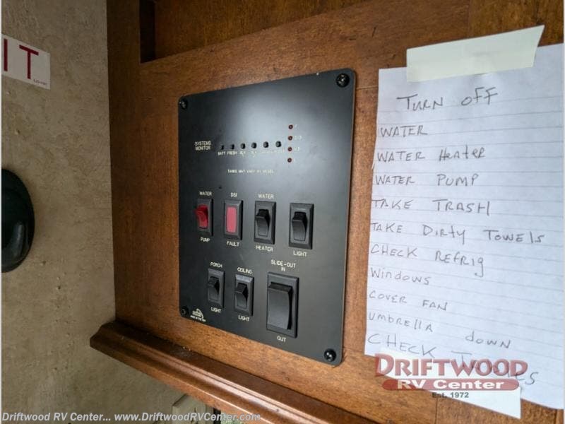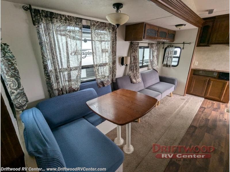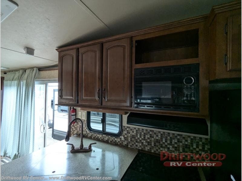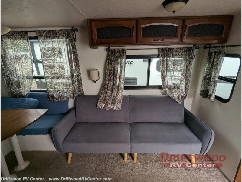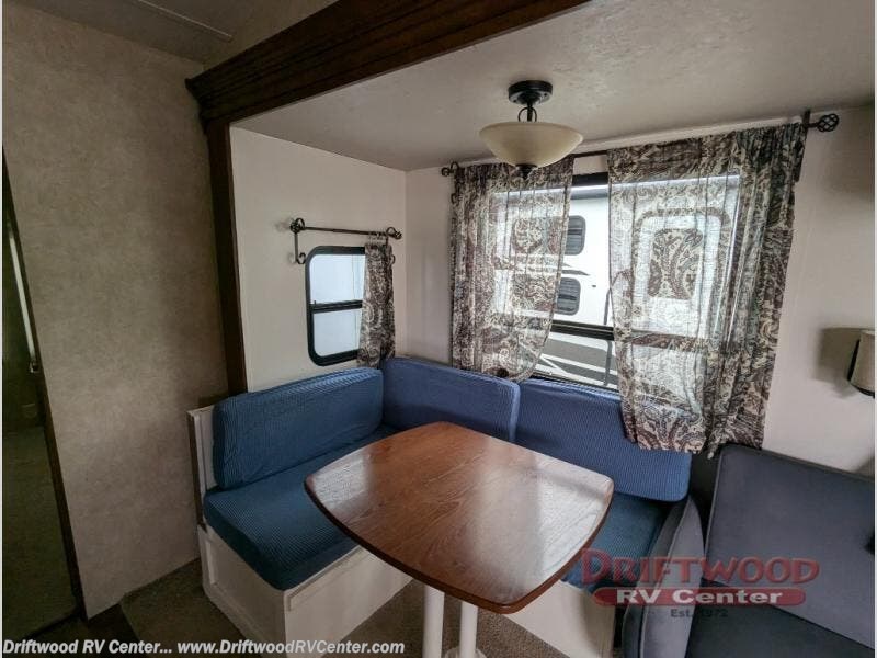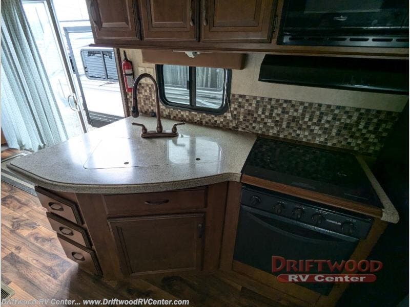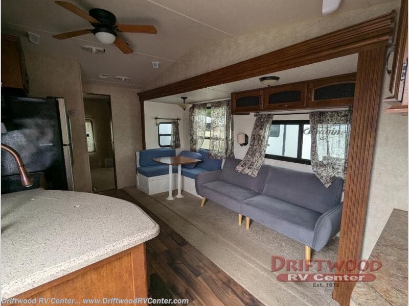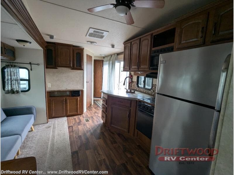 As you enter the trailer, to the left there is a double kitchen sink, three burner range, microwave, and refrigerator. The opposite side of the trailer has a slide with a u-shaped dinette and a sofa. Next to the sofa you will find an entertainment center.