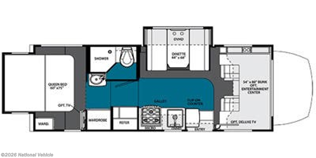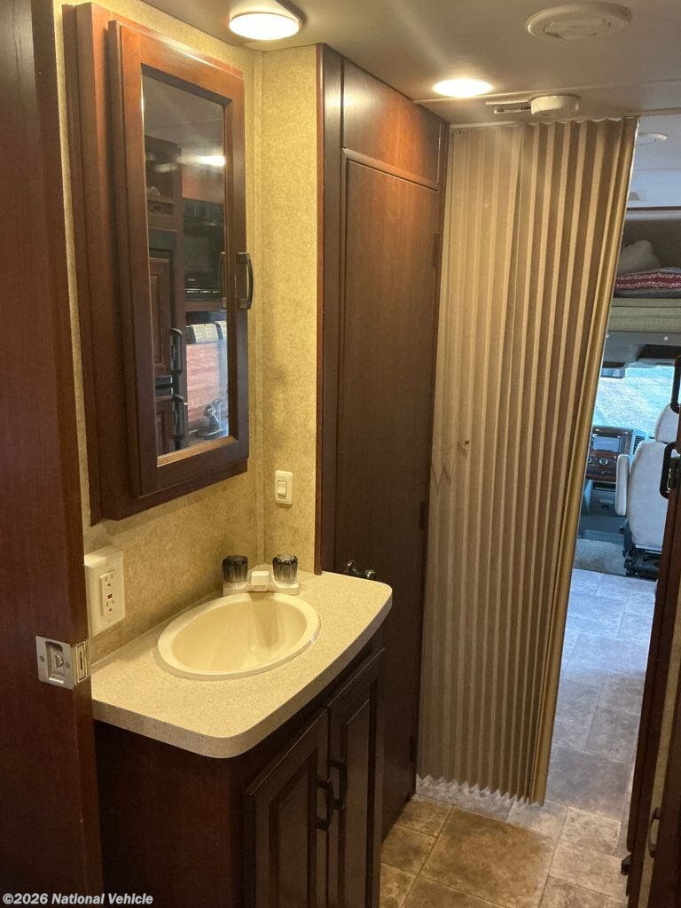 The bathroom is on the right as you proceed toward the rear of the motor home. Inside the bathroom there is a toilet and corner shower. Just around the corner of the bathroom you will find a sink. Across from the sink the large wardrobe provides added storage.