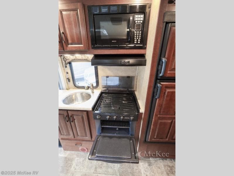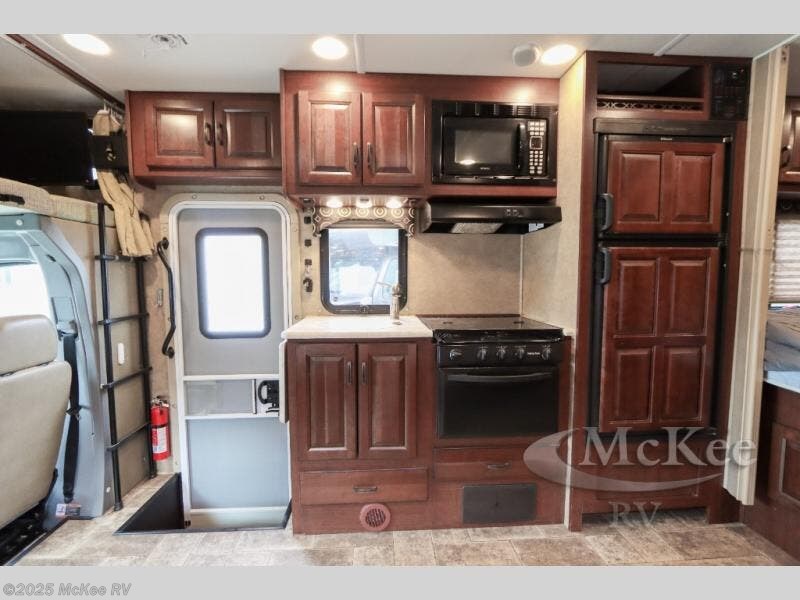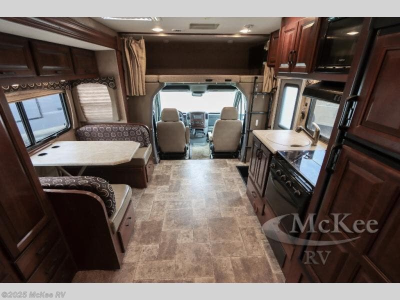 As you enter the motor home, to the left there is a flip-on counter, sink, range, microwave, and refrigerator. The opposite side of the motor home home has a slide with a dinette, pantry, and wardrobe.