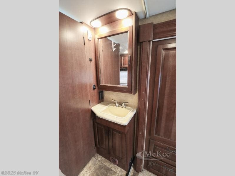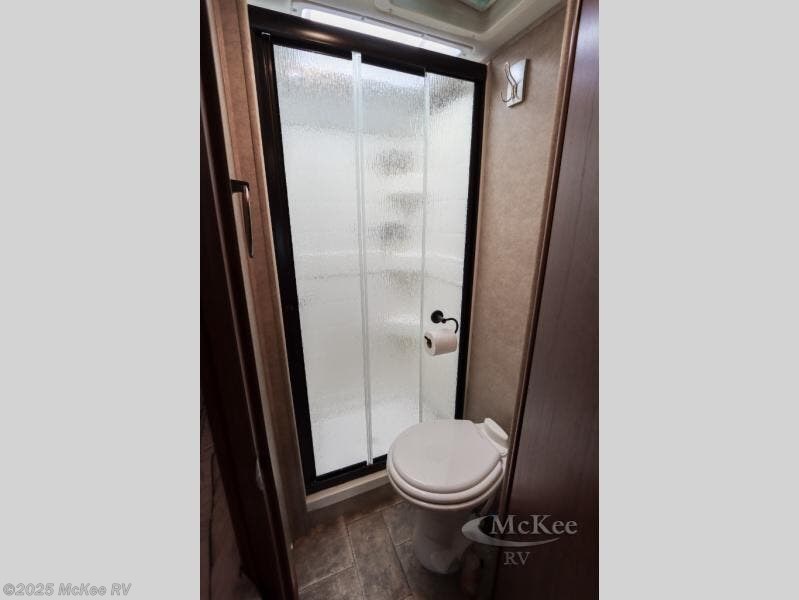 As you head toward the rear of the motor home you will find the bathroom in the corner. Just outside of the bathroom area there is a sink. Inside the bathroom you will find a toilet and shower.