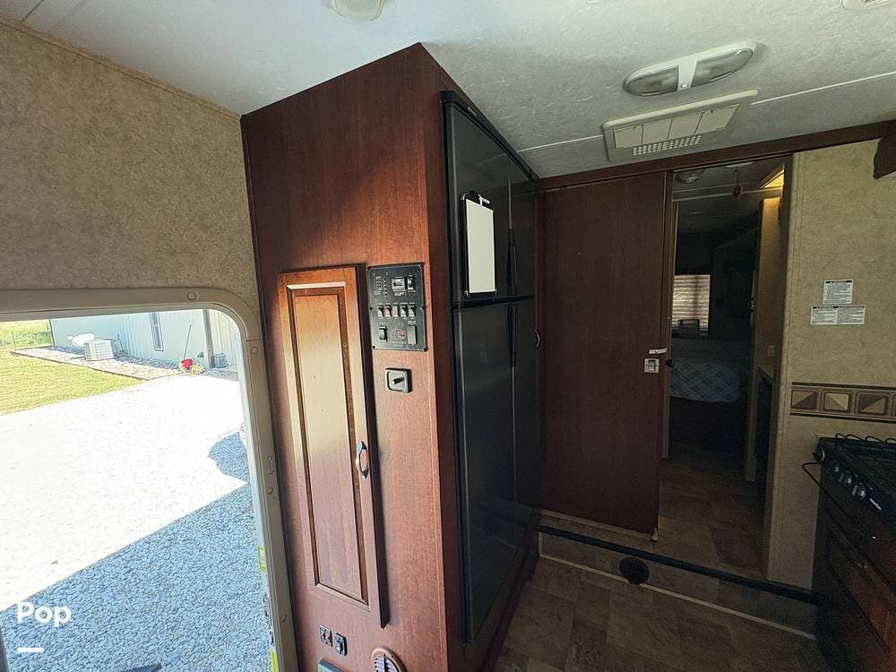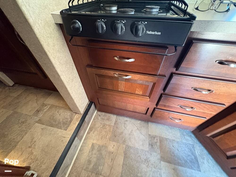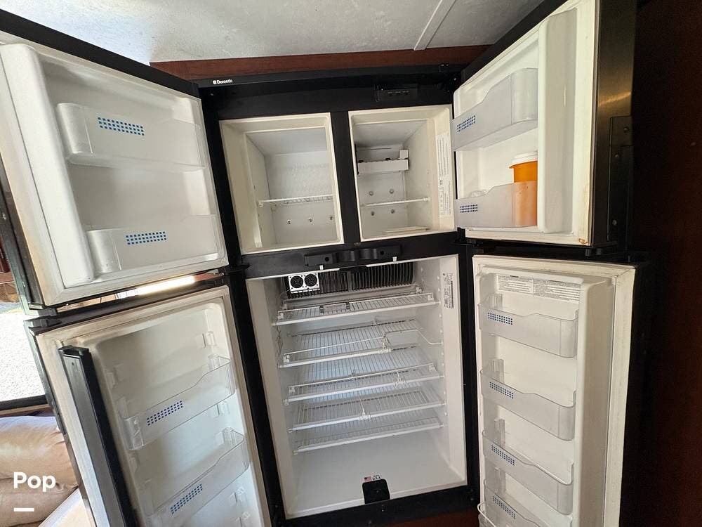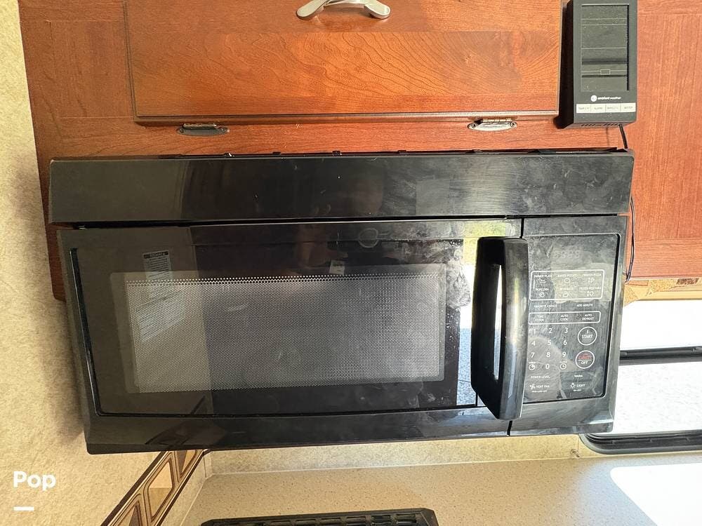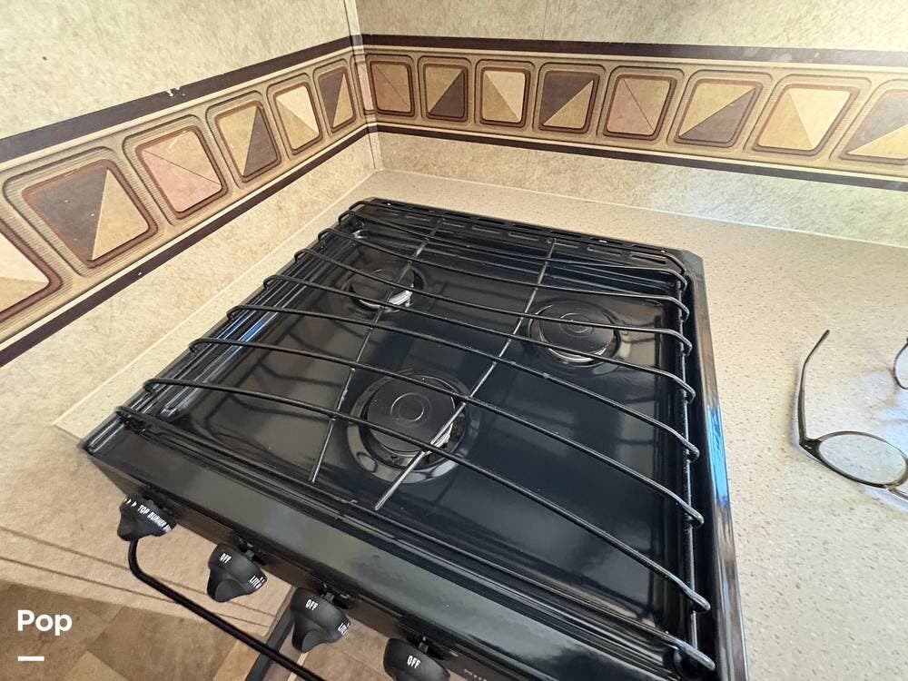 The kitchen features a three-burner stove, a mid-size refrigerator (operable via electric or propane), a microwave, a sink, and a pantry.