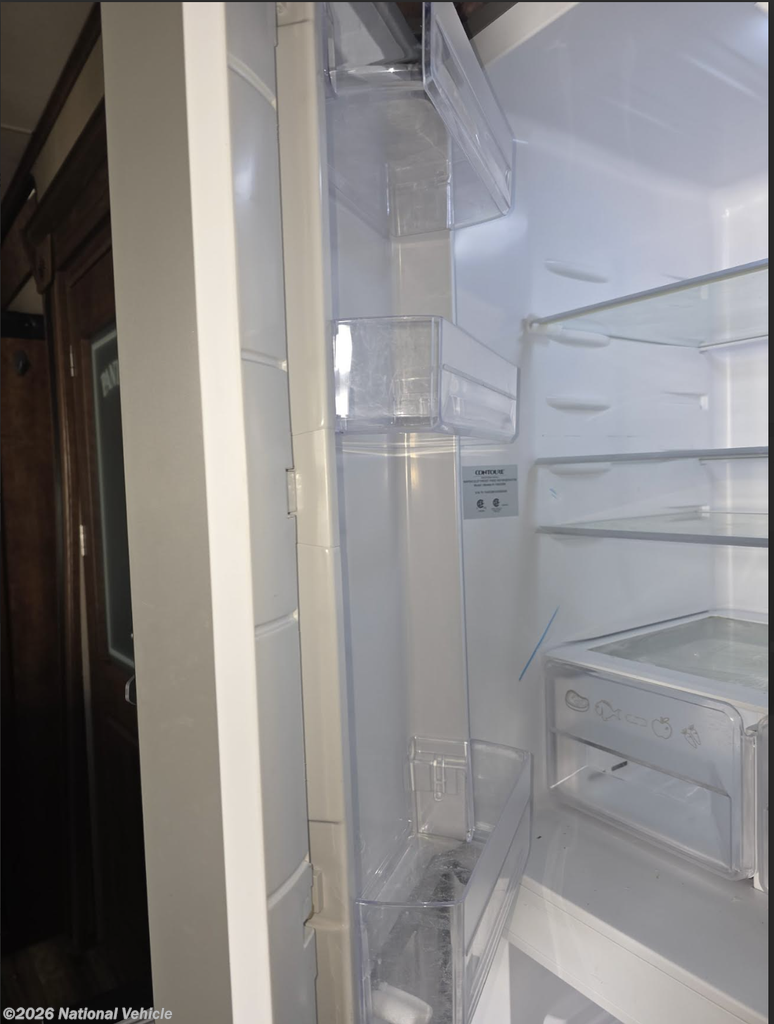 Inside, the spacious living area features two swivel rocker recliners positioned for maximum comfort and relaxation, complemented by three flat-screen televisions for entertainment throughout the coach. Climate control is effortless with three high-capacity A/C units, keeping the interior comfortable in any environment.