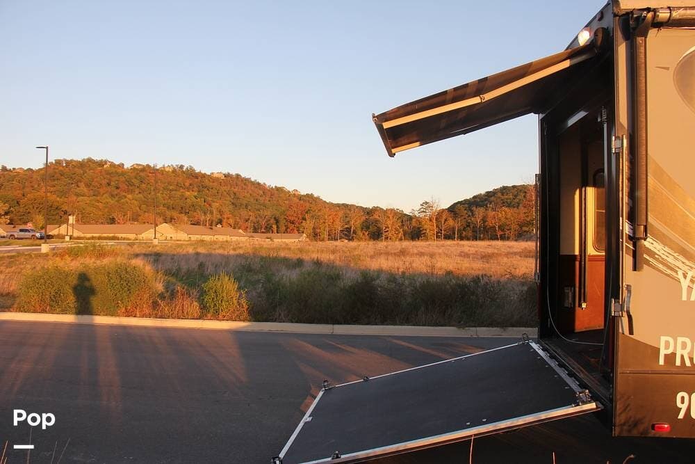 This 2014 Cyclone 3950 5th Wheel Toy Hauler RV by Heartland also features two side power awnings with LED lighting, a stackable washer/dryer, and a rear loading ramp.