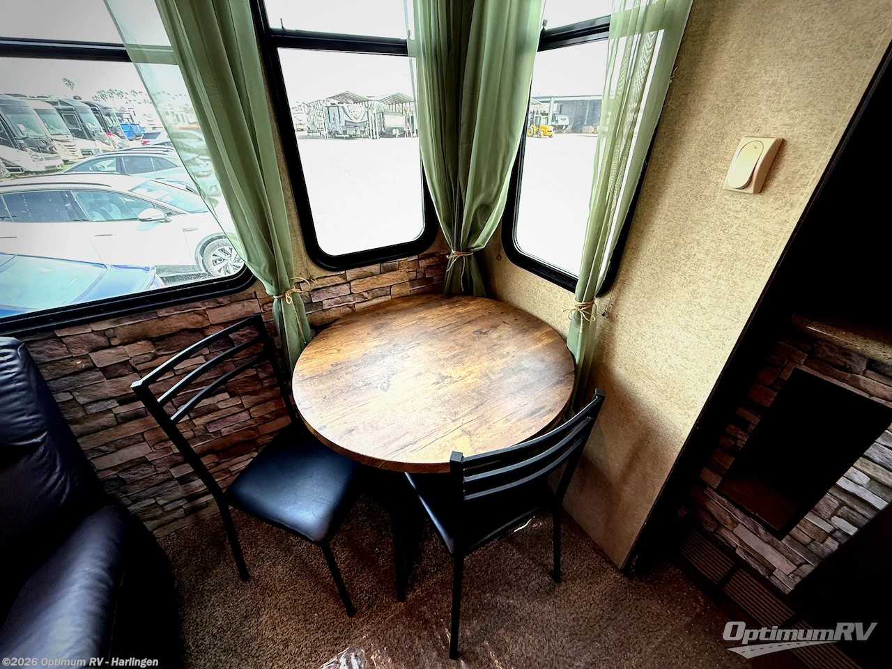 Opposite in the main living space find a large slide out sofa with two tables for meal time use. The sofa extends on one end providing even more seating. Enjoy the entertainment center nearby with a flat screen TV and storage both above and below. You can also opt. for the electric fireplace if you want to add a warm glow to your evenings indoors.