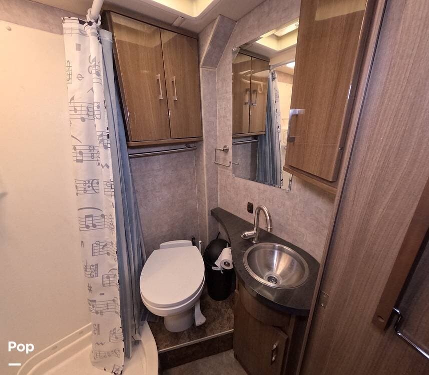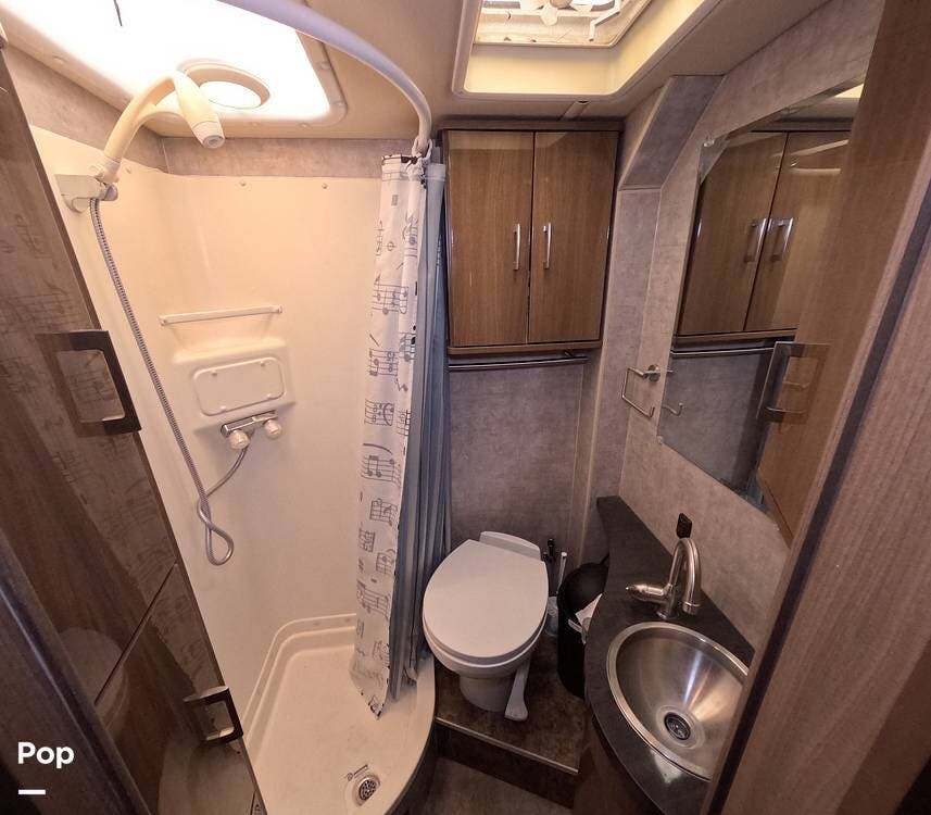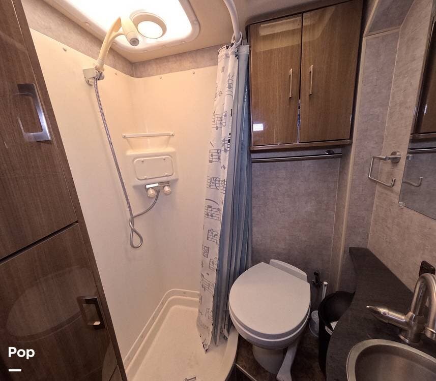 A fully equipped bathroom with a shower, toilet, and vanity gives the Navion iQ true self‑contained capability for extended touring.