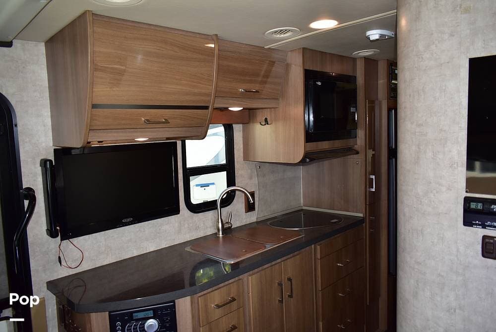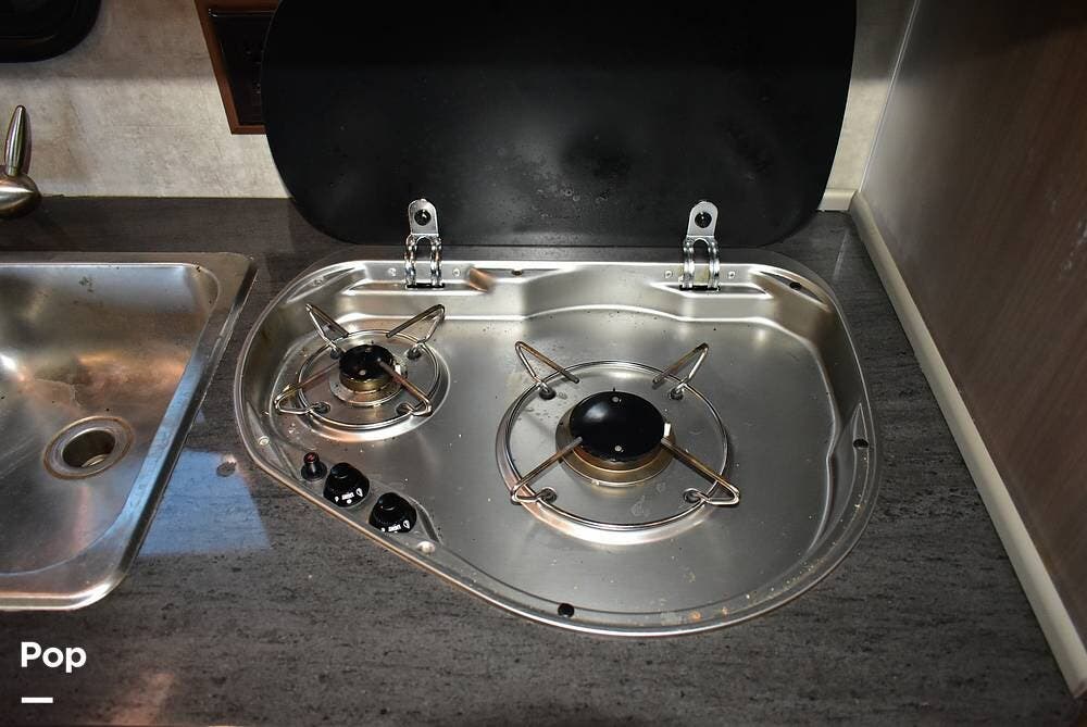 The swivel cab seats turn to face the living area, creating a lounge space that integrates the cab with the main cabin, while the galley includes a microwave/convection oven, two‑burner range, refrigerator/freezer, and stainless‑steel sink, making meal preparation straightforward on the road.