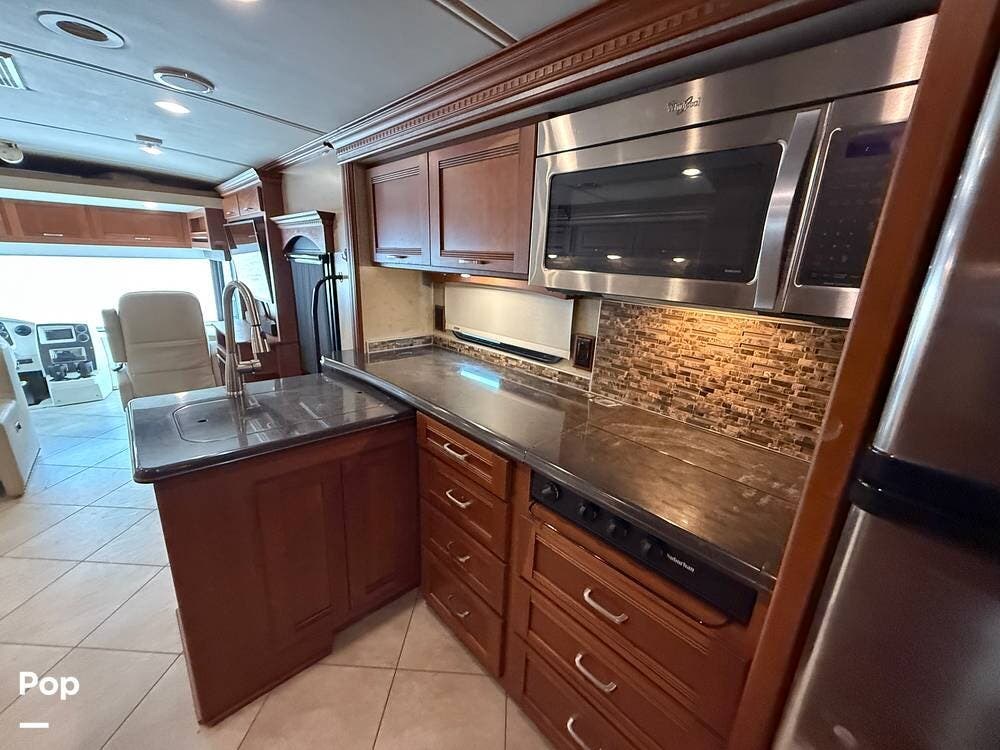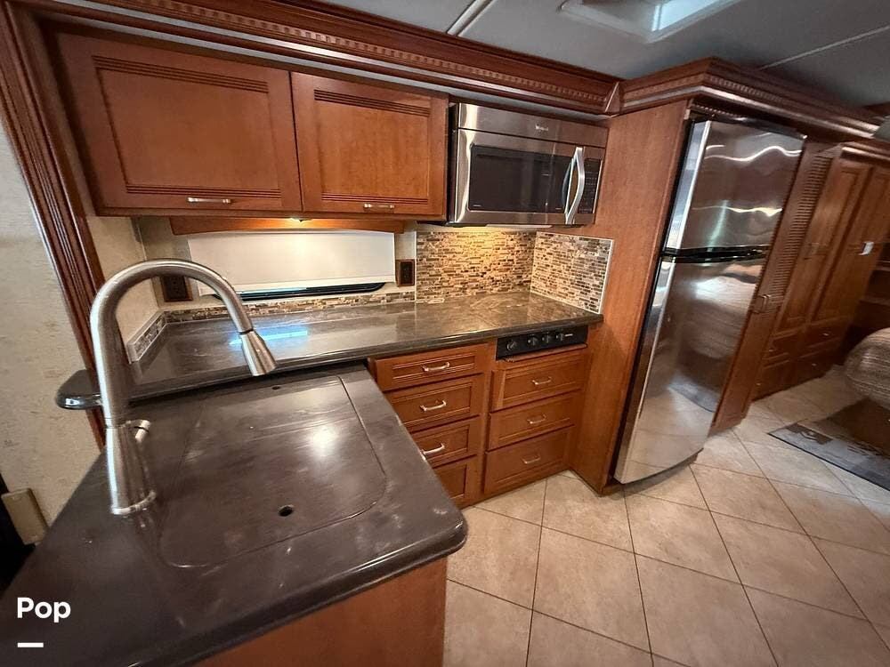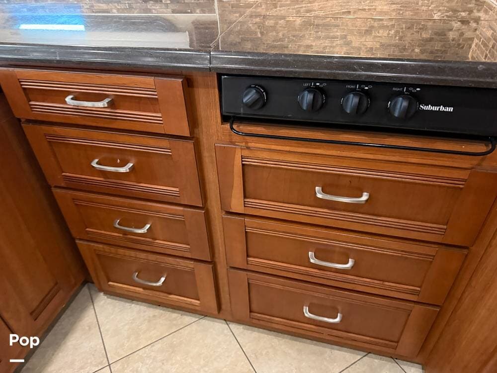 The kitchen features solid surface countertops and real wood cabinets throughout the coach.