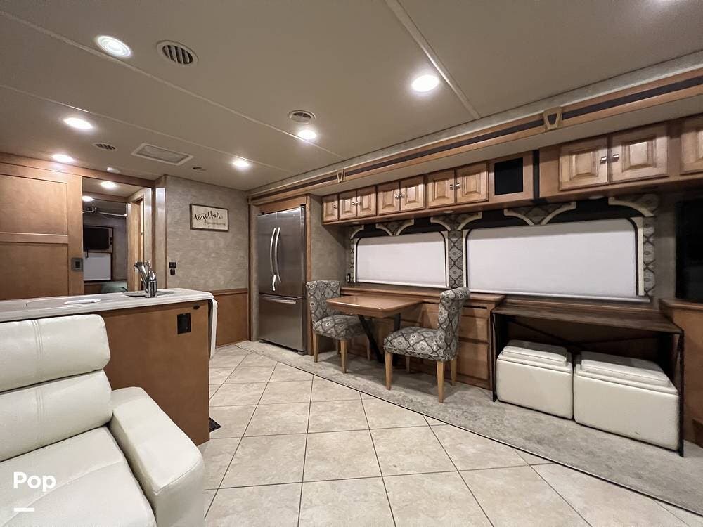 When you leave the main living area and walk into the kitchen/dining area, you have the Dine and Glide Dining Table and chairs, a kitchen island, and stainless-steel residential-style appliances.