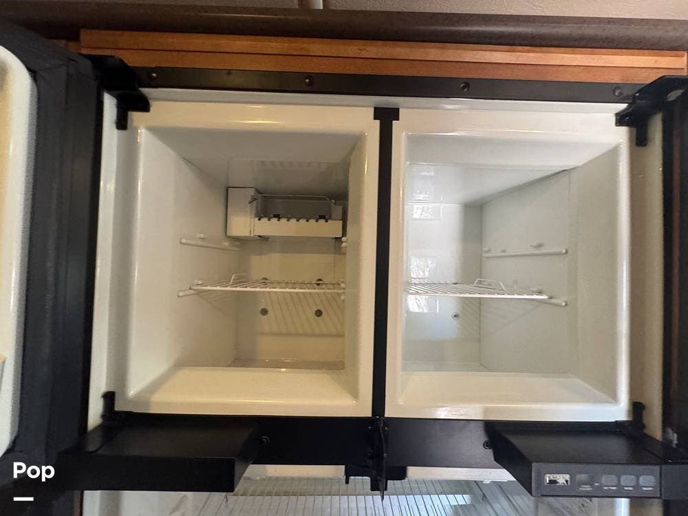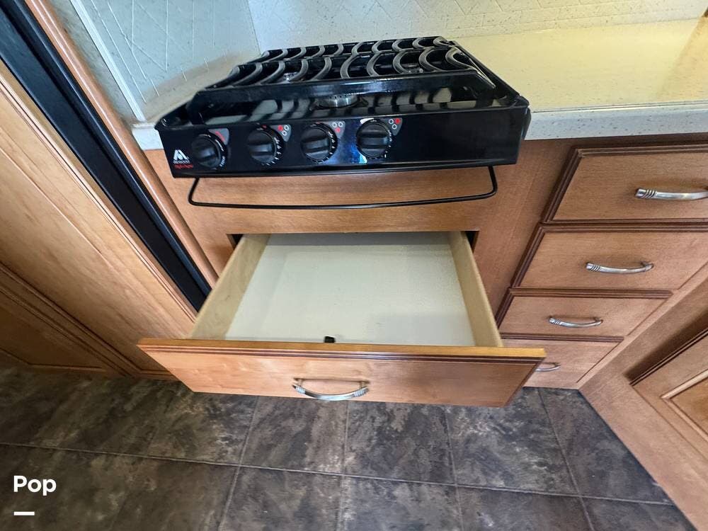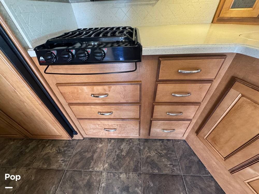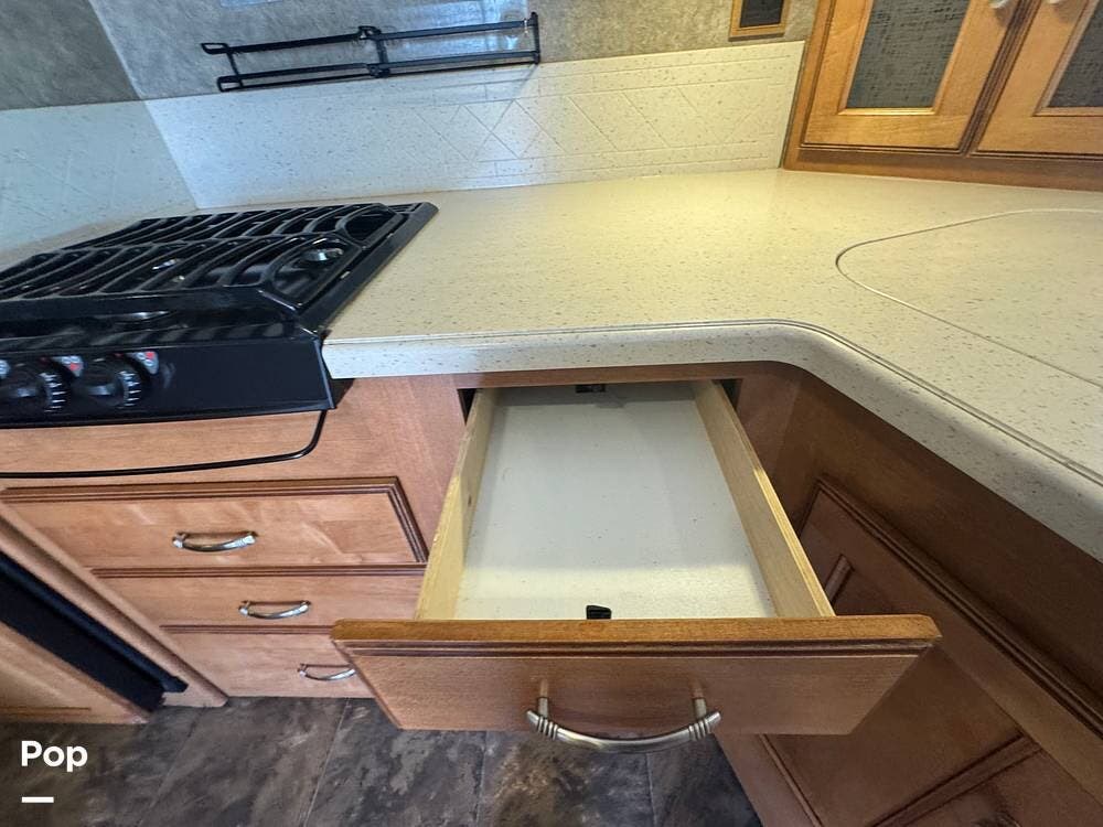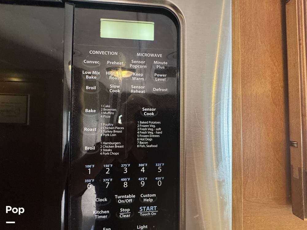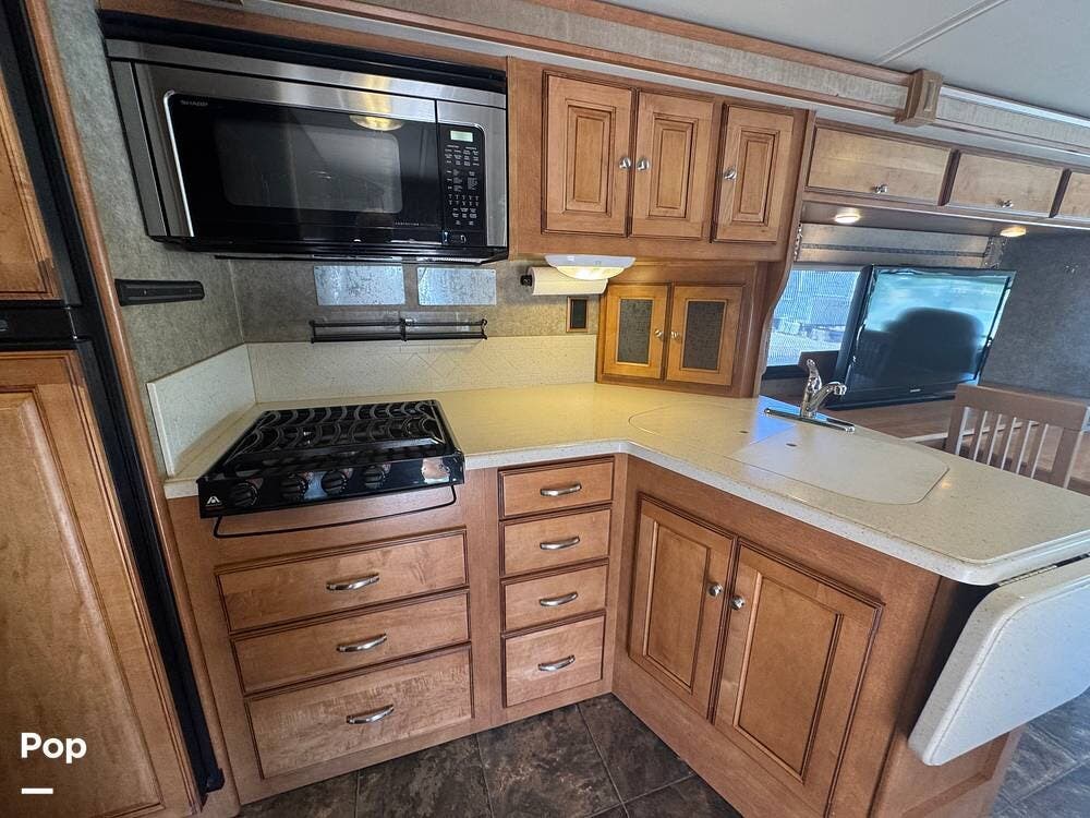 Moving into the center of the coach, the kitchen is designed with a residential feel, offering solid-surface countertops, a three-burner stove, a convection microwave, and a mid-size refrigerator that operates on electric or propane.