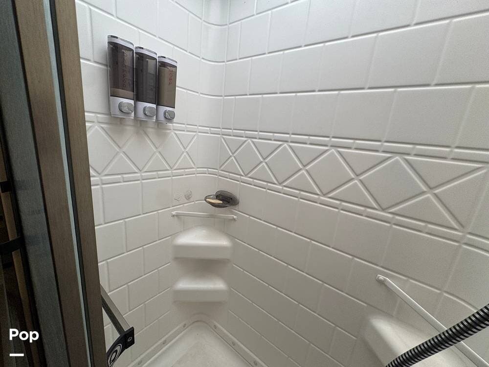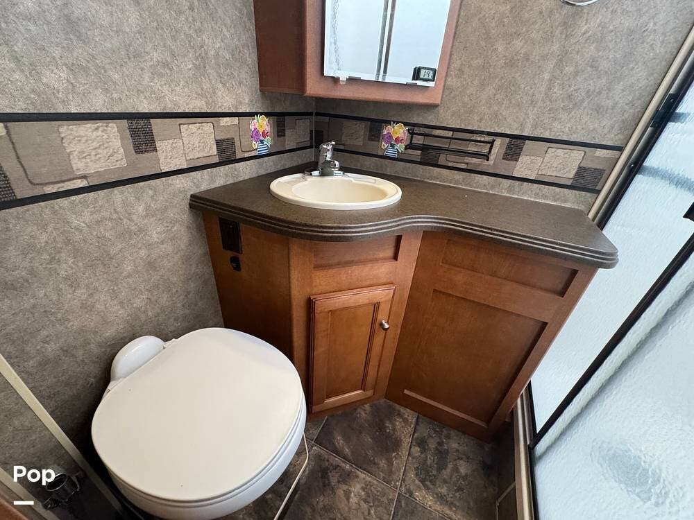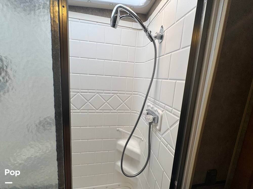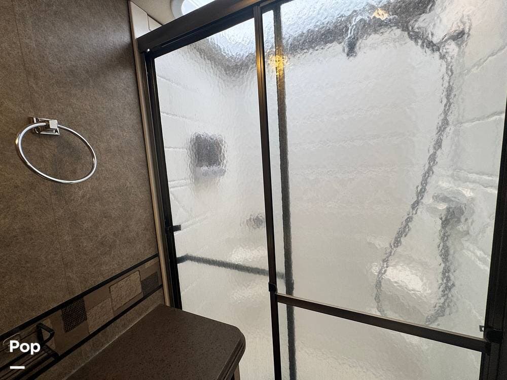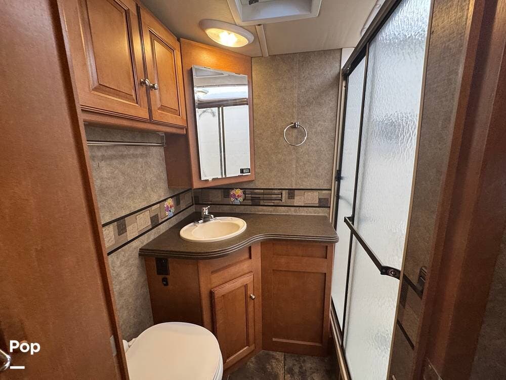 The mid-coach bathroom is fully enclosed and practical, featuring a porcelain toilet, vanity, and a glass-door shower with skylight, giving it a more upscale feel than many entry-level Class A coaches.