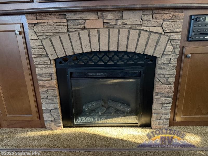 The main living and kitchen areas offer a corner refrigerator and shelves, a wardrobe, pantry, three burner range, microwave, and double kitchen sink. One slide has a dinette and sofa located on it. The other slide has an entertainment center and fireplace. There are two lounge chairs in the rear that you are sure to enjoy.