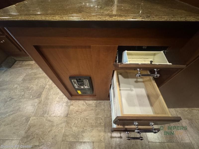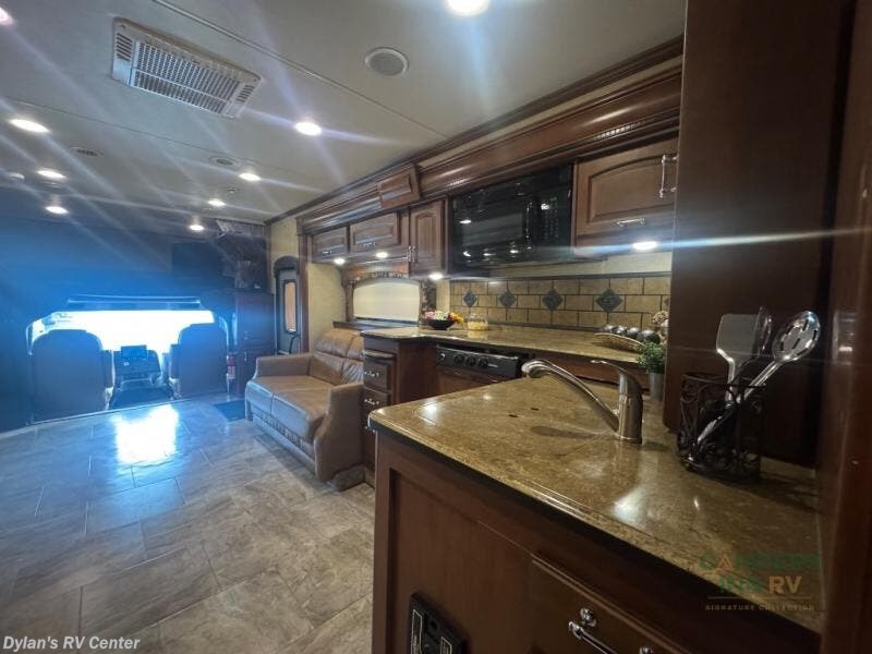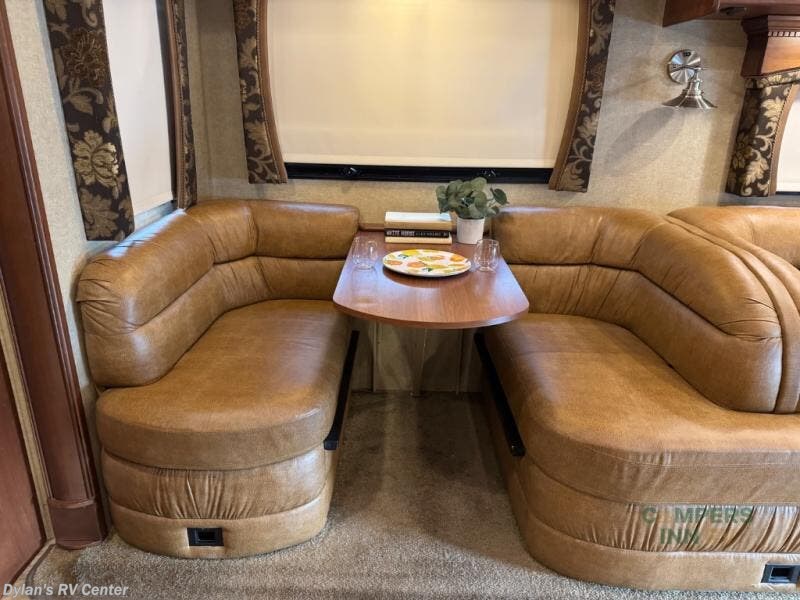 The Seneca 37TS motor home offers triple slides, and much room in the main living area. As you enter the motor home, to the left is a slide with a sofa, microwave, hide-a-bed and double kitchen sink. The opposite side offers a dinette ensemble slide, pantry, refrigerator, and second pantry. In the front you will find a front cab-over queen bed, storage, and a LCD TV/DVD. The bathroom has a toilet, and shower on one side of the motor home, and a sink and medicine cabinet on the other side of the motor home. The rear bedroom offers a king bed slide, and a wardrobe. There are plenty of overhead cabinets throughout the inside of the motor home as well as exterior storage. You can even choose a few options such as a front entertainment center with a 32" TV, a booth dinette, and a washer and dryer.