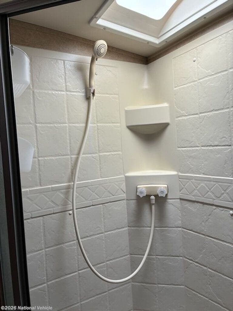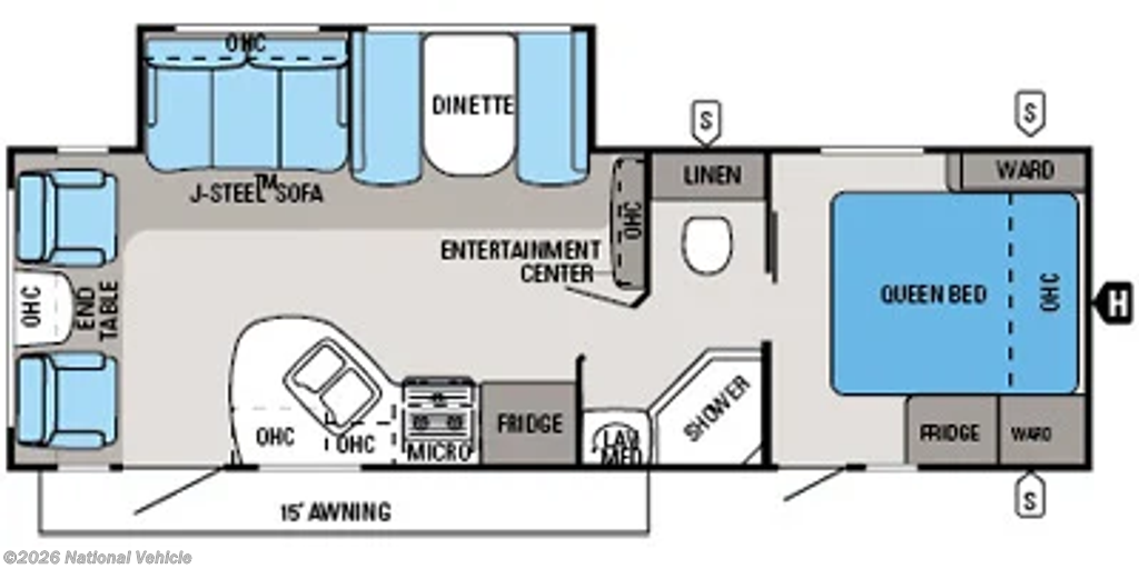 Up front, the private master bedroom offers a queen bed with overhead storage and dual wardrobes for convenience, while the walk-through bathroom provides a spacious shower, vanity, and linen cabinet for a home-like experience.