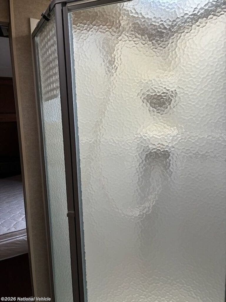 The rear living area features large panoramic windows, plush seating including a tri-fold sofa and dinette, and an entertainment center perfect for relaxing after a day outdoors. The mid-kitchen is thoughtfully designed with solid-surface countertops, a double sink, three-burner range, microwave, and ample cabinetry?giving you all the tools to prepare meals on the road.