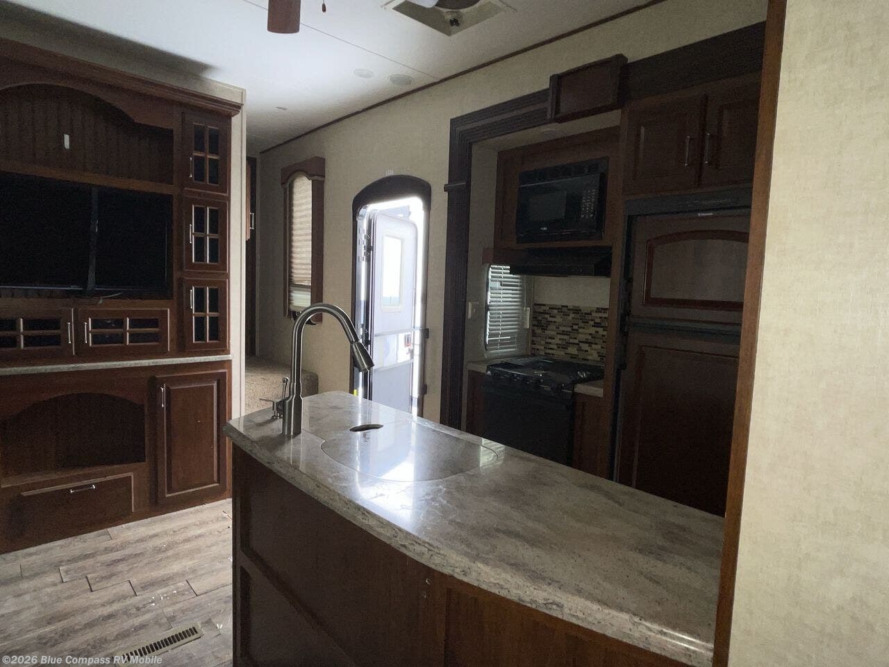 Step inside and find a wide open interior with dual opposing slides in the main combined kitchen and living room area. There is a hide-a-bed sofa sleeper and free standing dinette slide straight ahead through the entry door. An entertainment center along the interior wall is convenient for viewing from anywhere in the room.