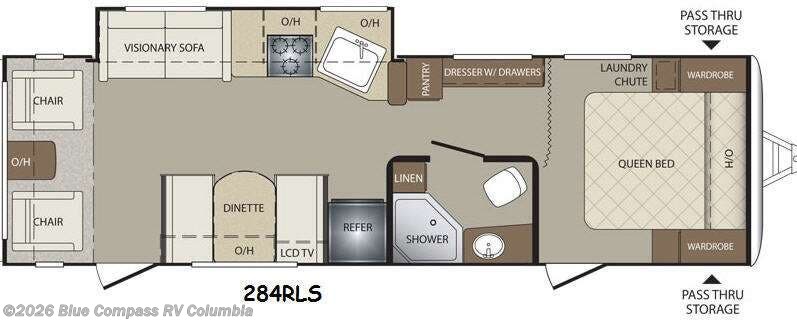 As you step into model 284RLS you will find two swivel rockers with an end table between on your left. There are also overhead cabinets the entire width of the trailer for storage above the rockers.