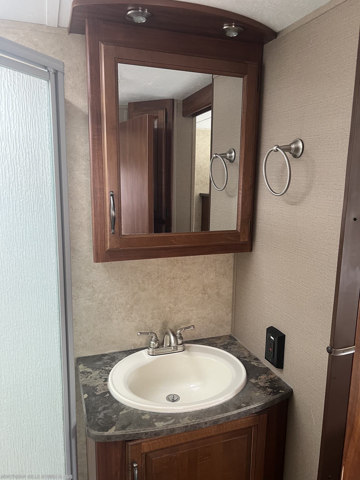 Enjoy your RV trips more than ever before in this 2014 Keystone Cougar 331MKS. This 2014 Keystone Cougar 331MKS welcomes you into the Keystone family! The sleep capacity allows you to bring up to 4 along on your travels in this rig. With three slides, this rig feels roomy and spacious inside. The fridge, oven, stove make the perfect combo for eating well on the road. Spend time together as a family in the living area with the TV. With the booth dinette, you’ve got the perfect place for family meal times. Comfort is important when RVing, and you’ll find just that with the queen bed. If you like your rig cool in the summer and warm in winter, this A/C option can do the trick. If you’re thinking of heading off grid, this rig has a 60 fresh water tank. While the inside of this rig is enough on its own, the outside also features awning, exterior speakers, external shower, leveling jacks, slideout and spare tire kit. Make sure kids don’t track mud inside with the outside shower.
