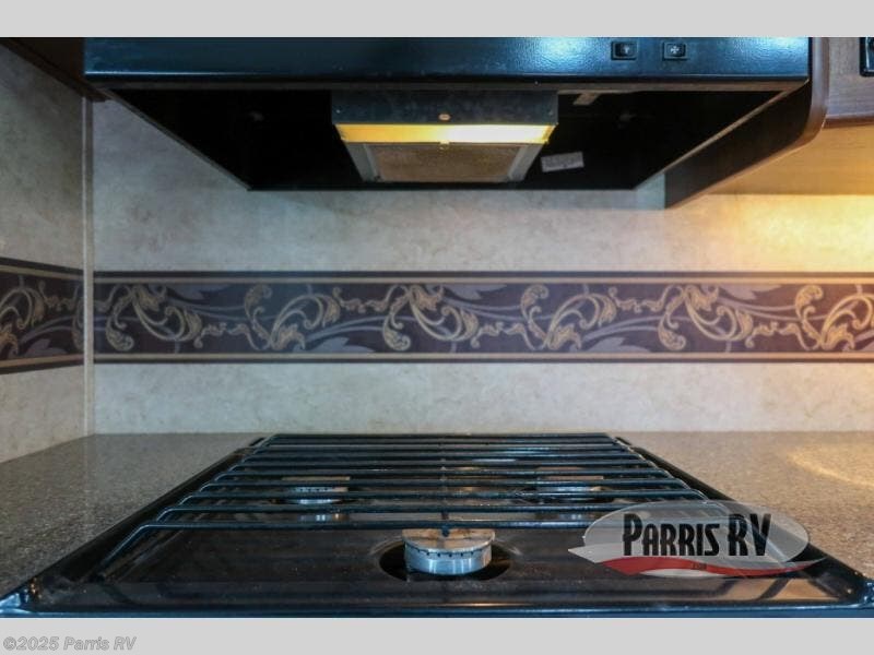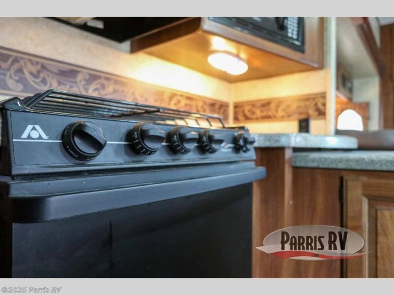 Along the rear wall in the kitchen find a double sink for easy cleanup, a counter area, pantry, and refrigerator. The remaining appliances are found as part of the L-shaped hide-a-bed slide where there is an L-shaped counter with plenty of storage and prep space, and a three burner range, plus so much more!