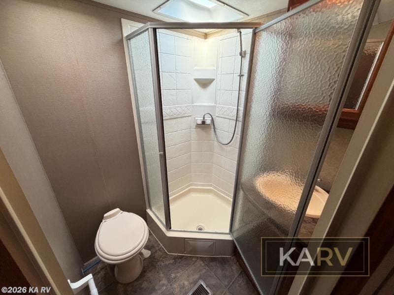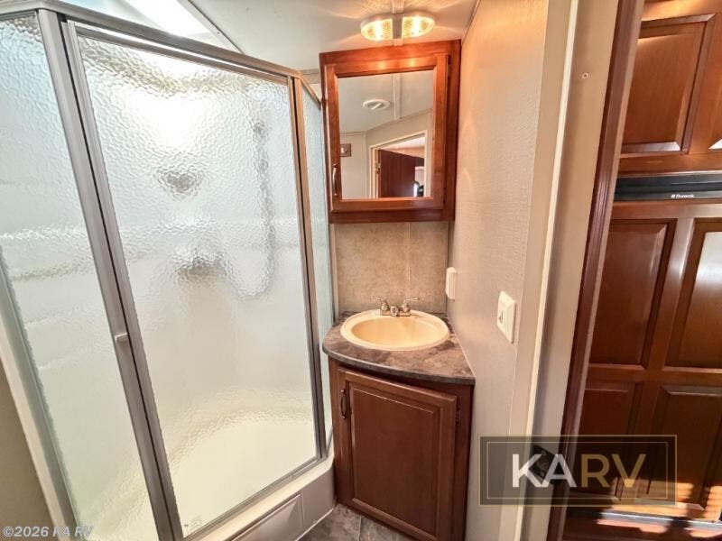 Model 21RBS offers plenty of storage both inside and out starting just inside the side entry door with a closet/pantry on your immediate left. Straight ahead there is a corner bath with neo-angle shower, toilet and sink.