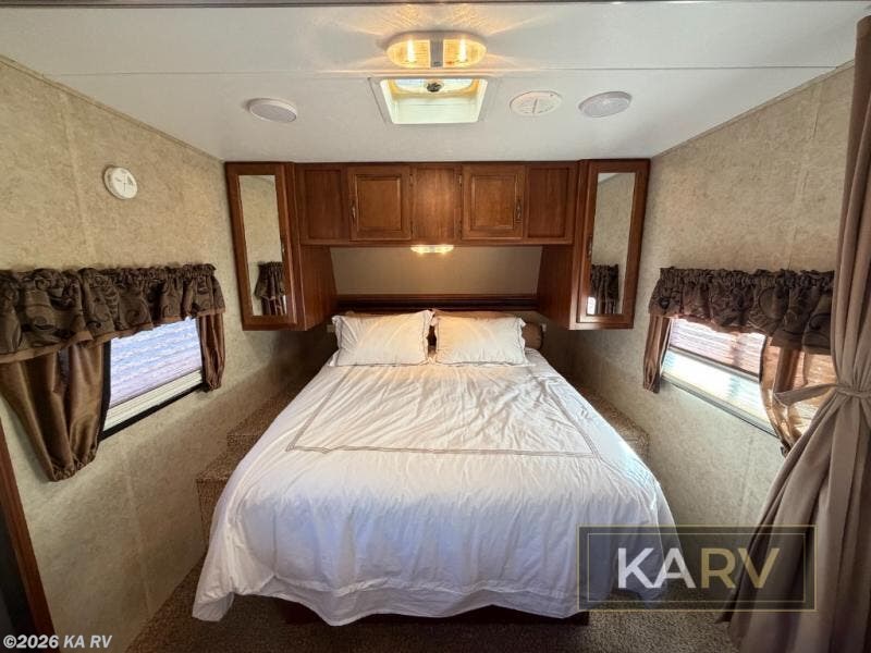 The front features a queen sized bed with dual bedside wardrobes, overhead cabinets, and a convenient laundry chute. Plus there is an LCD TV mounted on the wall to enjoy, and an outside pass-through storage compartment, and so much more!