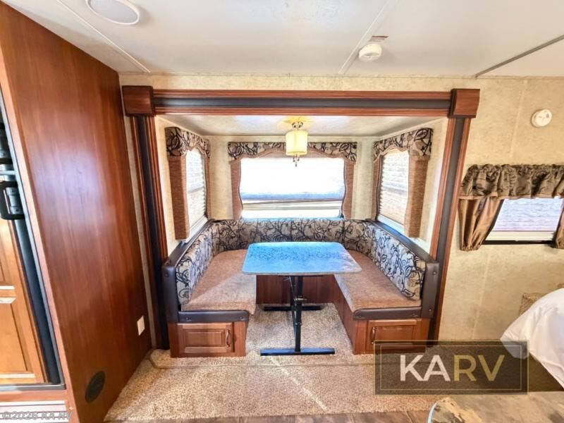 As you move further into the unit find that the kitchen has all that you need and more to prepare and create meals and snacks while you travel. There is a refrigerator opposite the counter area with three burner range and double kitchen sink. The counter features an extension for when you need a bit more prep space. There are plenty of overhead cabinets, plus lower cupboards and drawers. And opposite you will find seating for everyone as you enjoy your meals in the u-shaped dinette slide.