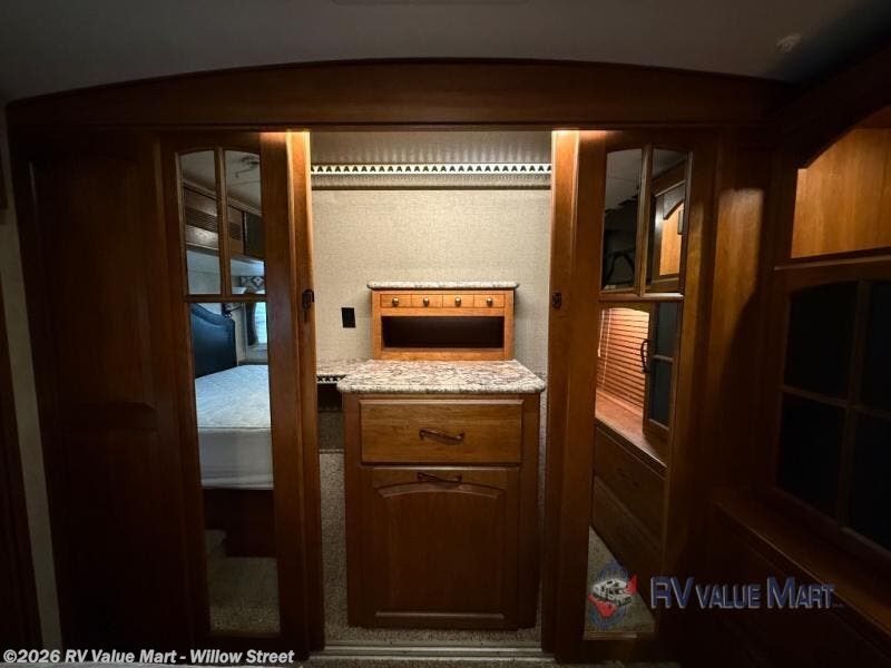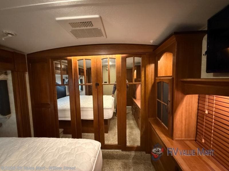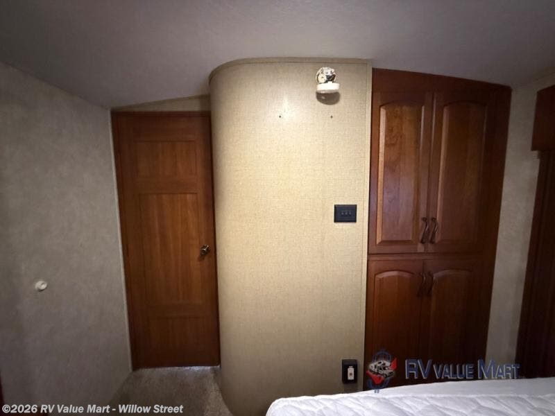 The front private bedroom features a quiet retreat and provides a queen bed slide, or optional king. The bed has ample storage beneath it. The front wall wardrobe features sliding doors and a hamper inside. There is also a bank of drawers opposite the bed with overhead cabinets on either side plus an HD TV overhead, and so much more!