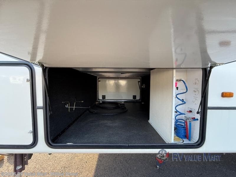 Step inside and be greeted by a wide open combined living room and kitchen with dual opposing slides. There is a dinette for mealtime and theater seating for two just to the left of the entry door. The entire slide features overhead storage also.