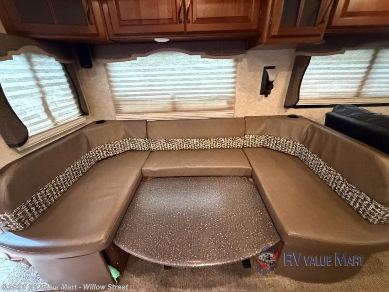 The rear hide-a-bed sofa features more seating to enjoy the nearby entertainment center, and also to provide more sleeping space if needed at night. Again, overhead cabinets provide ample storage all across the back.