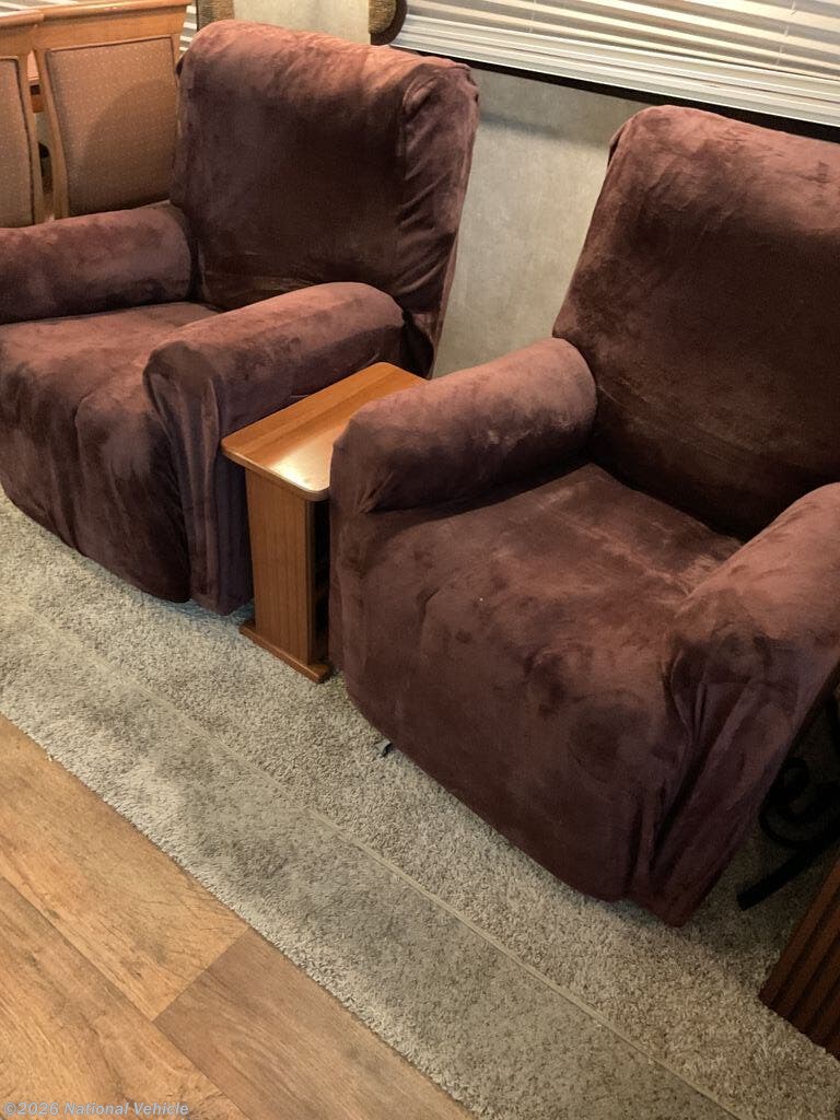 The living area features a flat screen TV with home theater system, two recliners, and an electric fireplace.