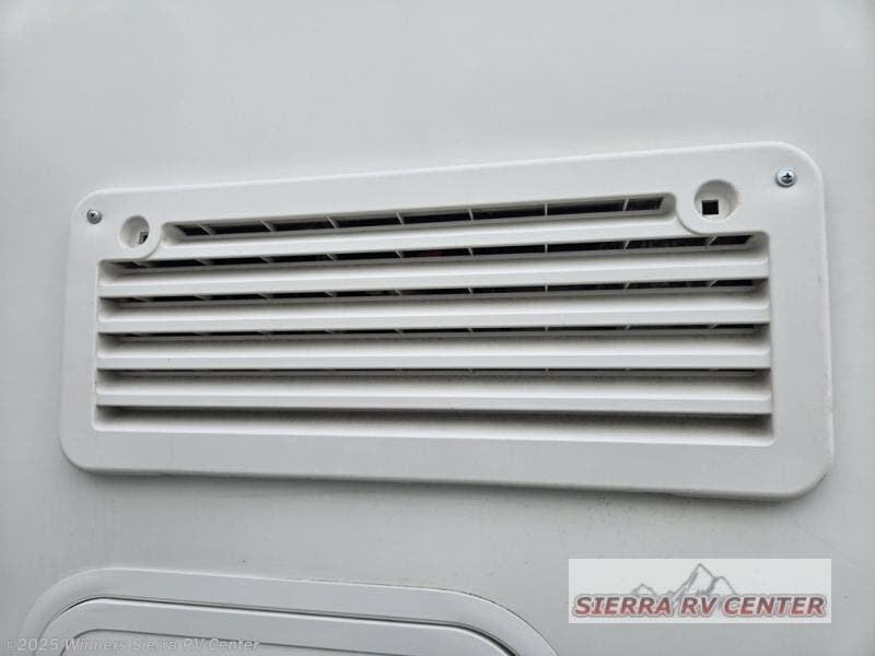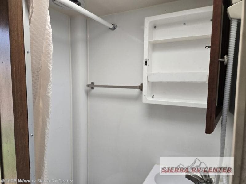 The wet bath opposite the dinette features a toilet, sink, and shower. There is also a dual pane skylight and medicine cabinet with mirrored door. A handy wardrobe can be found just outside the bathroom door.