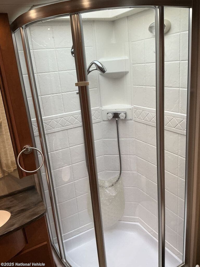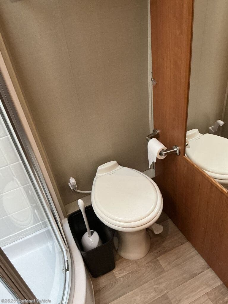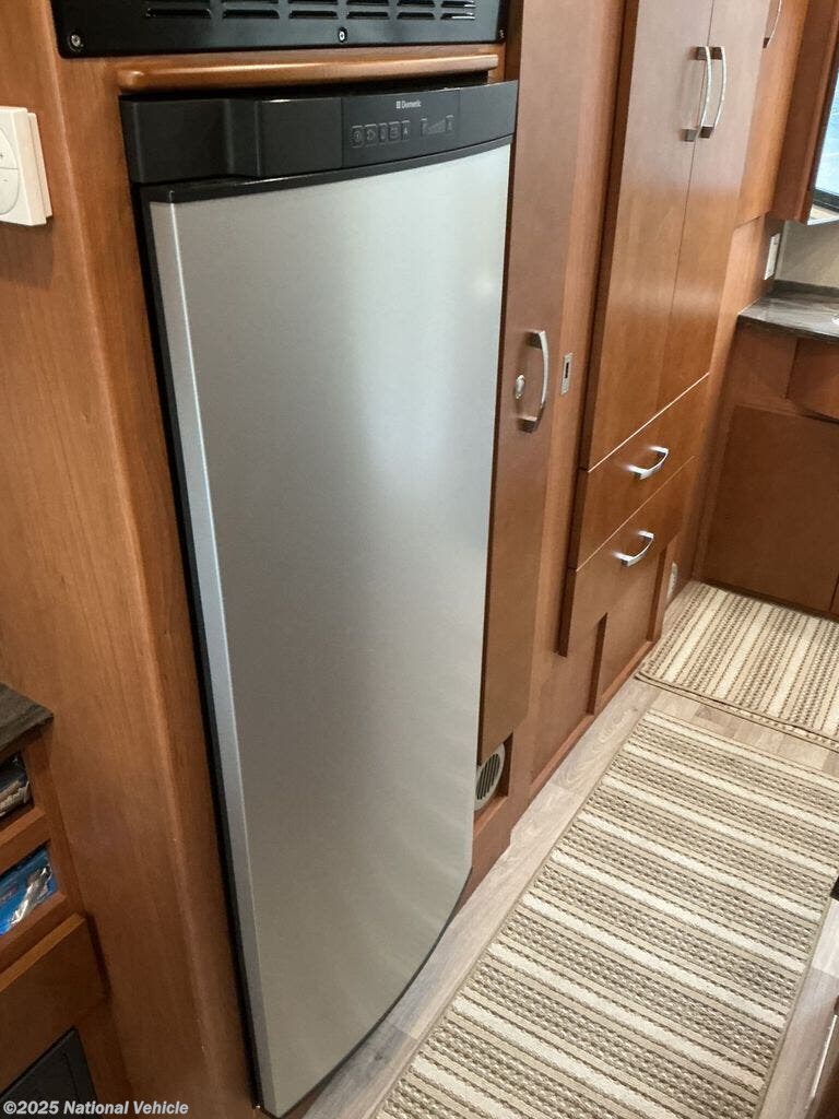 The galley is equipped for serious meal prep: a 2-burner cooktop, convection microwave, sink with cover, and abundant cabinetry. Opposite sits a compact refrigerator and a pull-out pantry for dry goods. In back, the full bathroom includes a residential radius shower, vanity, medicine cabinet, and wardrobe storage.