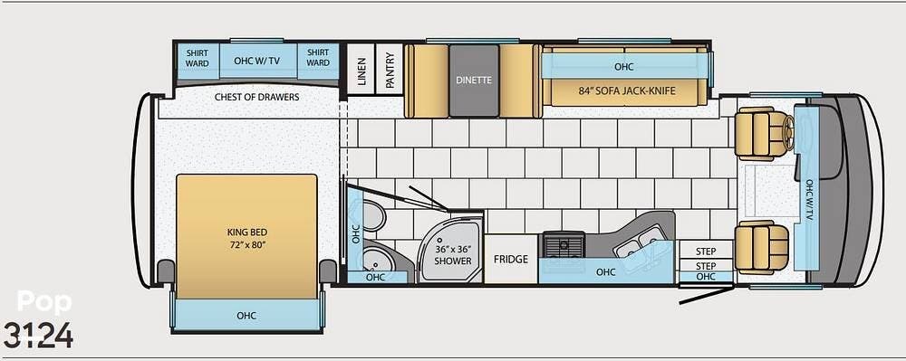 Once you're on board, you'll see how comfortably and ergonomically this RV was designed. Family members and guests will love the intuitive layout, featuring handy swivel driver and passenger Flexsteel seating, a convertible dinette sleeper, a full-size jackknife sleeper sofa, flat-panel TVs, solid countertops, and a master sleeping quarters with a king-size bed, padded headboard, and abundant storage.