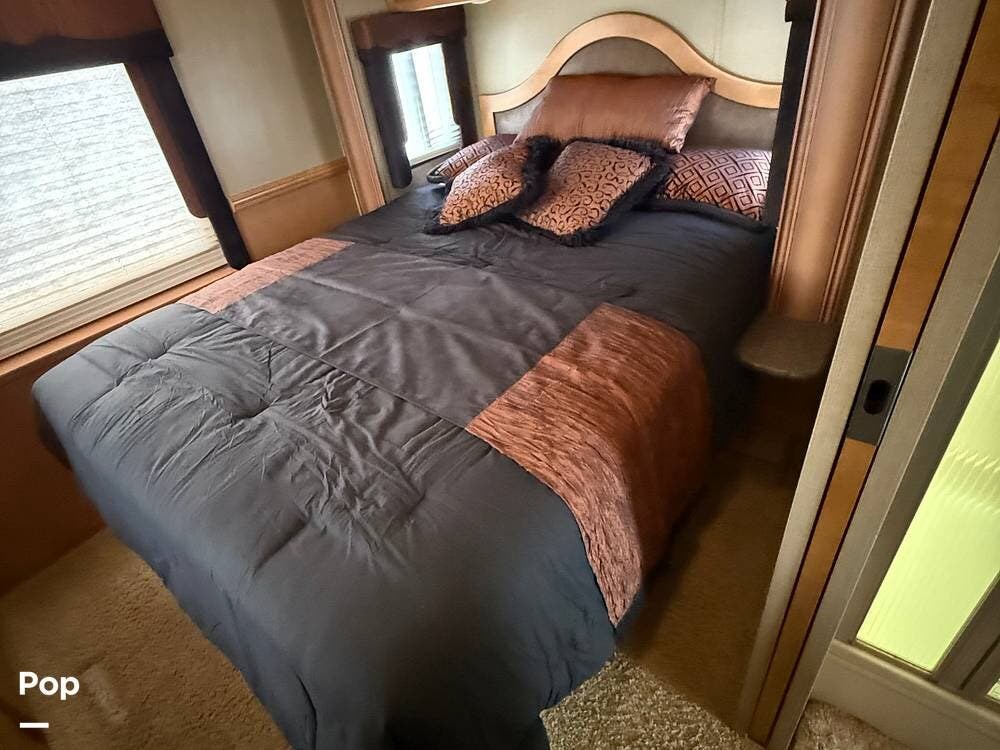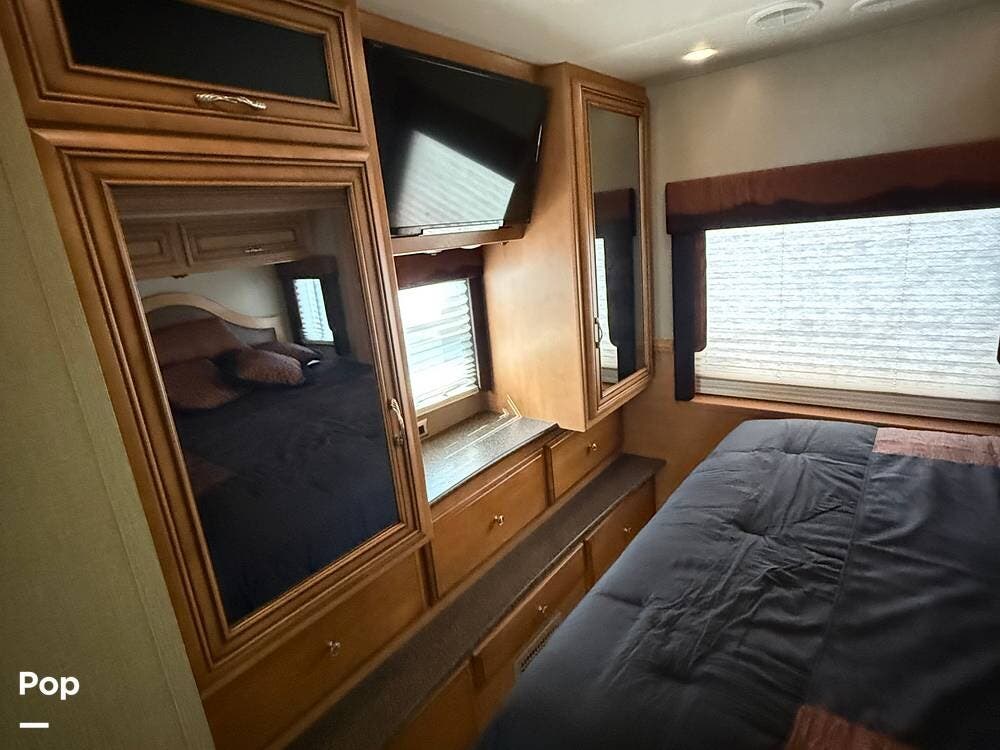 Moving to the rear of this RV, the master suite features a queen-sized bed and a mirrored wardrobe, separated by a sliding door, offering a cozy retreat.