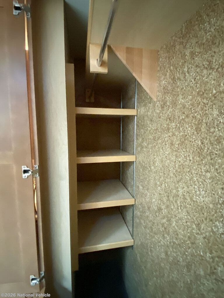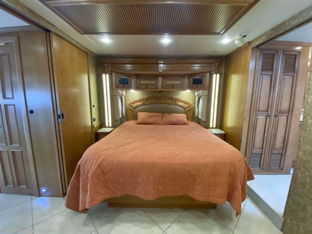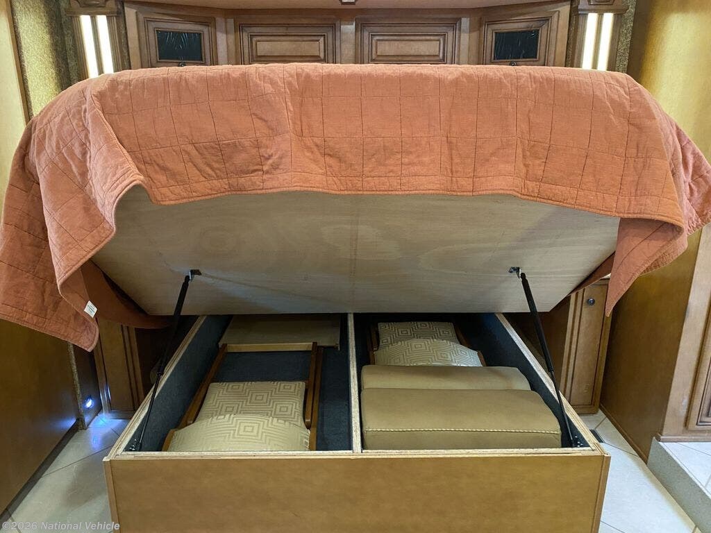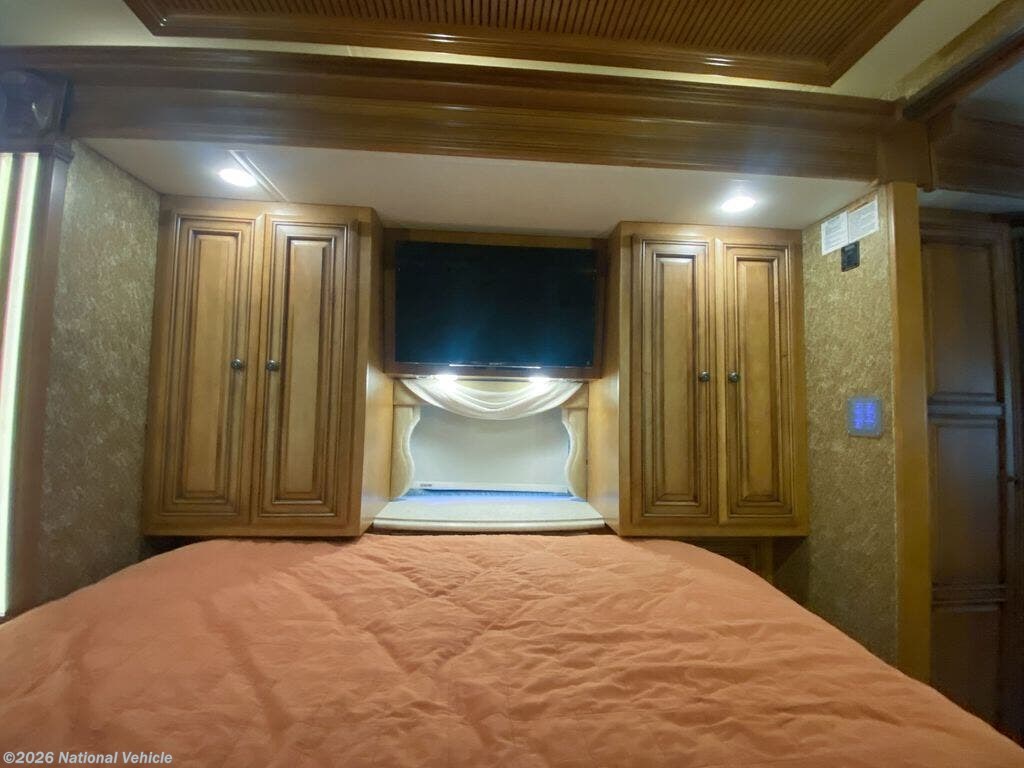 Rear master bedroom with king bed slide, overhead storage, swivel-mounted TV