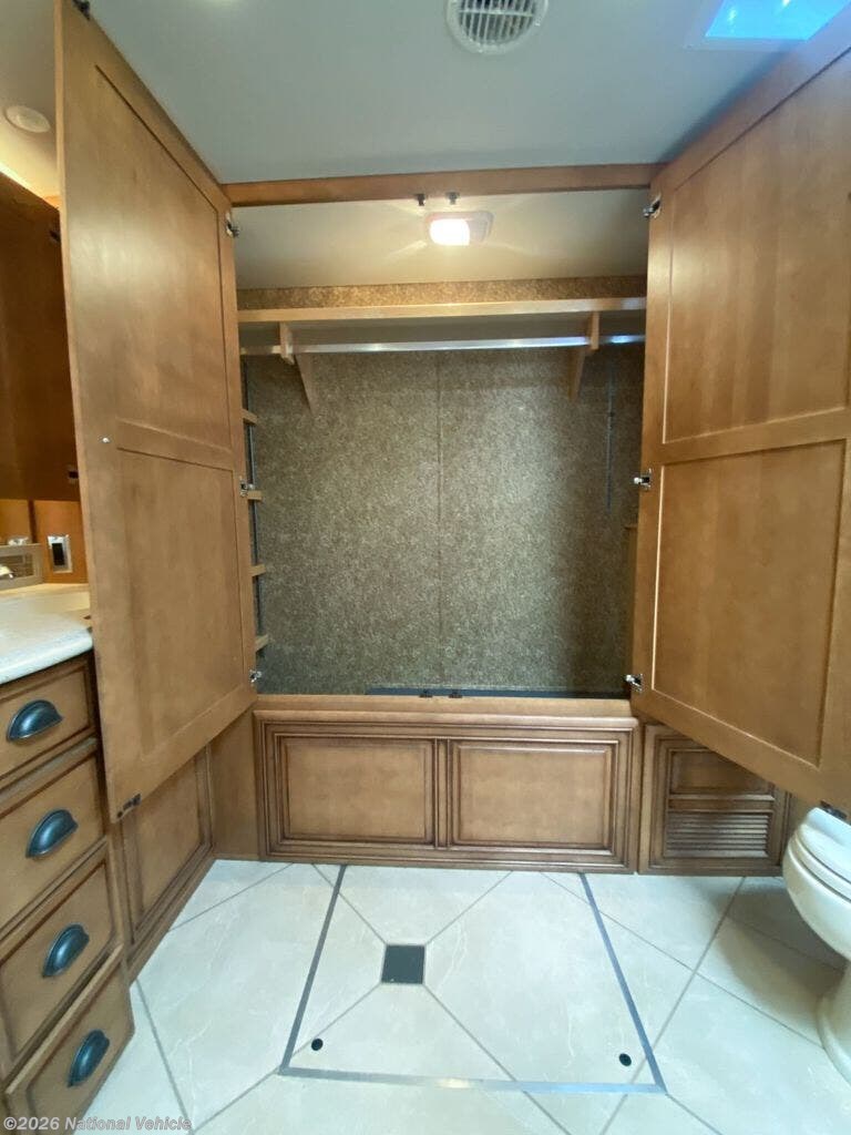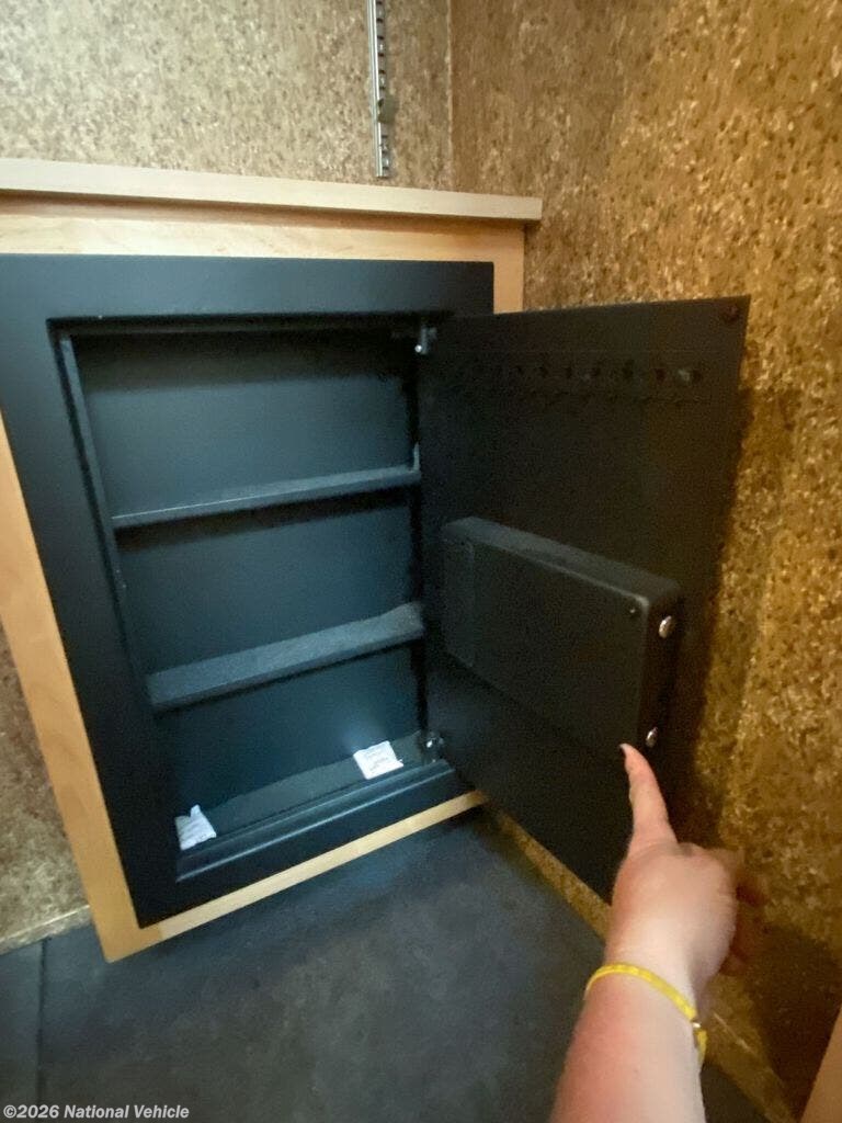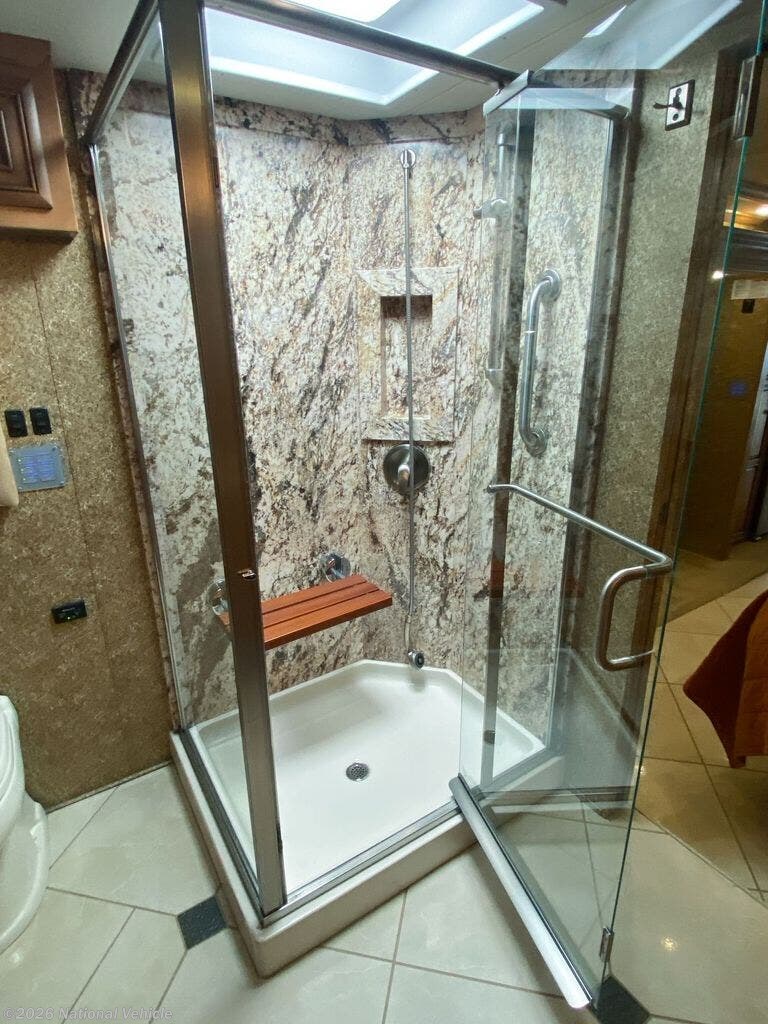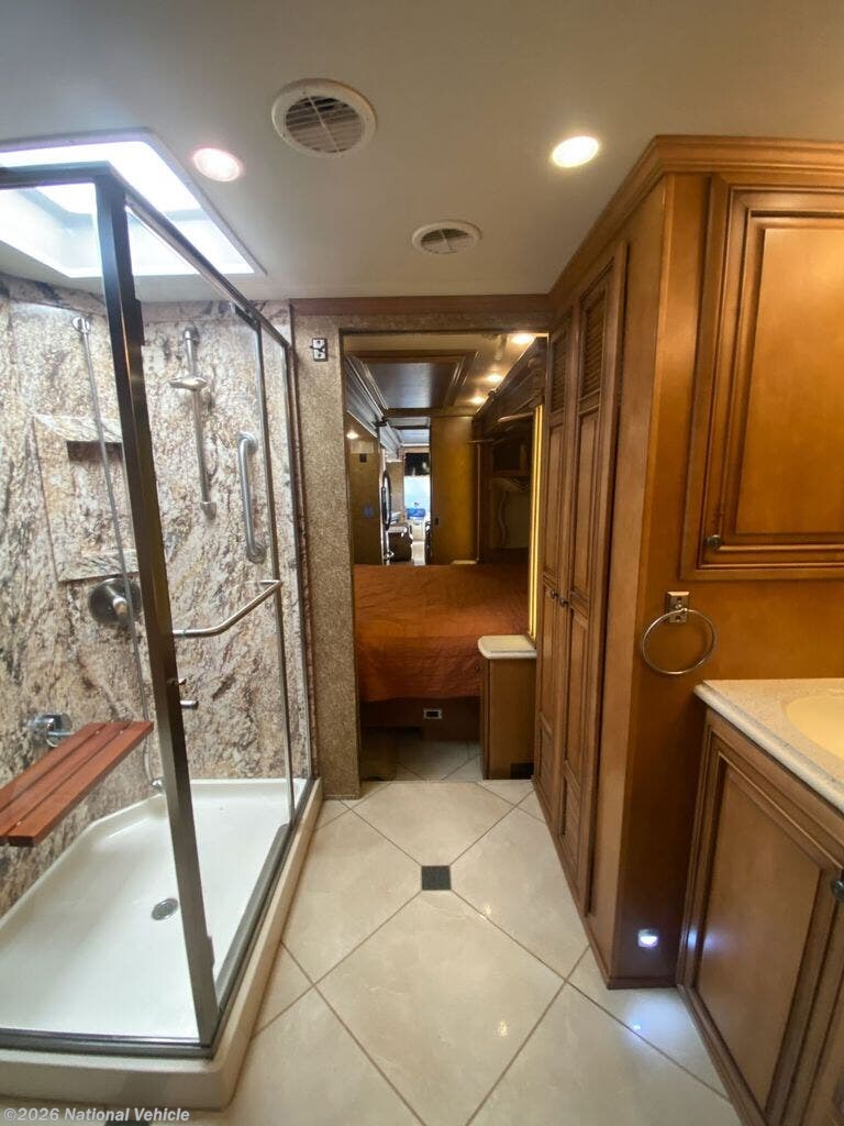 Rear master bath with dual vanities, walk-in shower with skylight, fold-down seat, wardrobe, and built-in digital safe