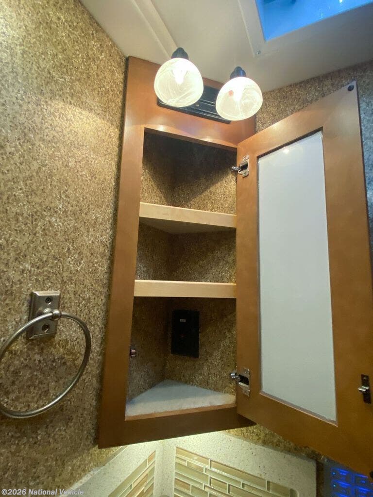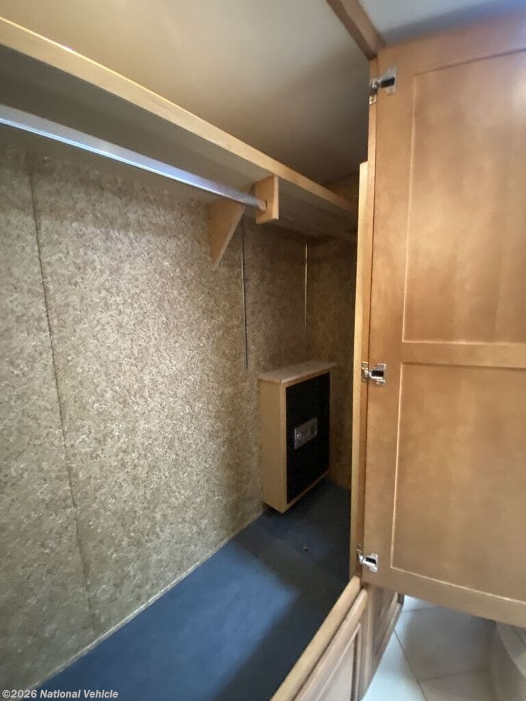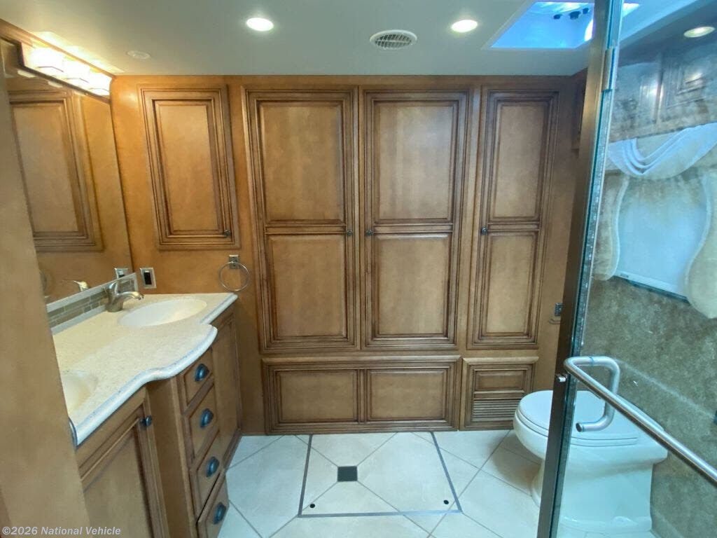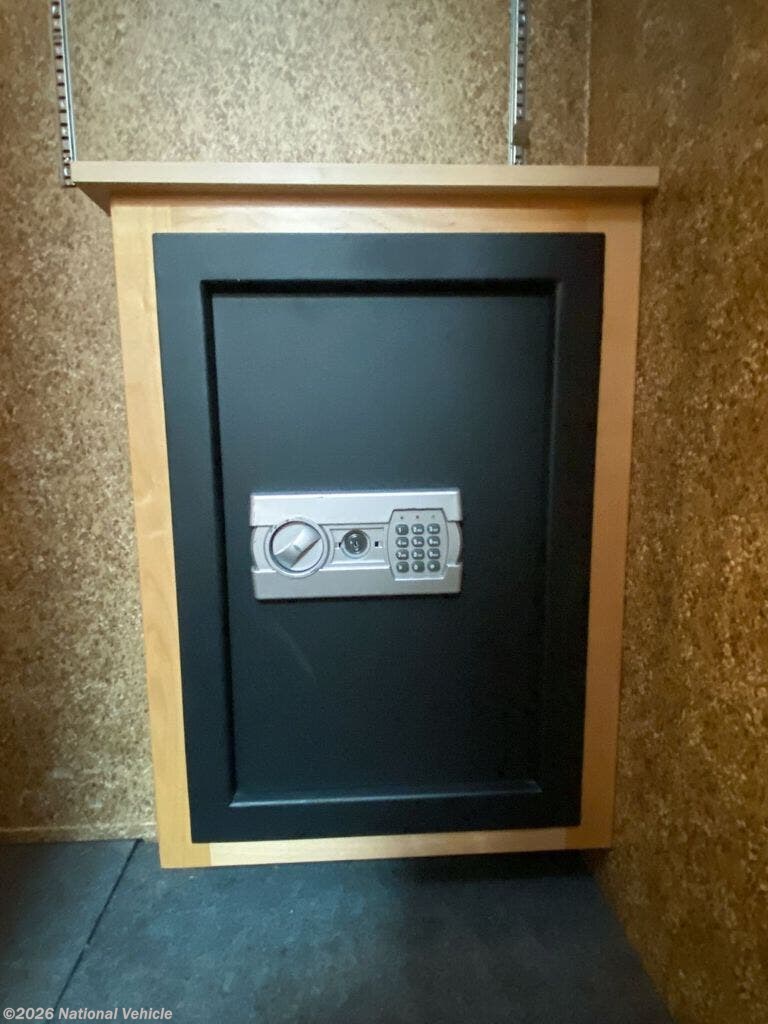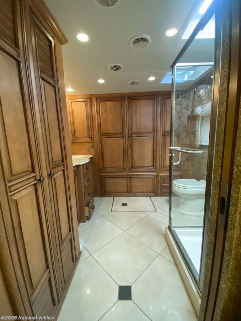Rear master bath with dual vanities, walk-in shower with skylight, fold-down seat, wardrobe, and built-in digital safe