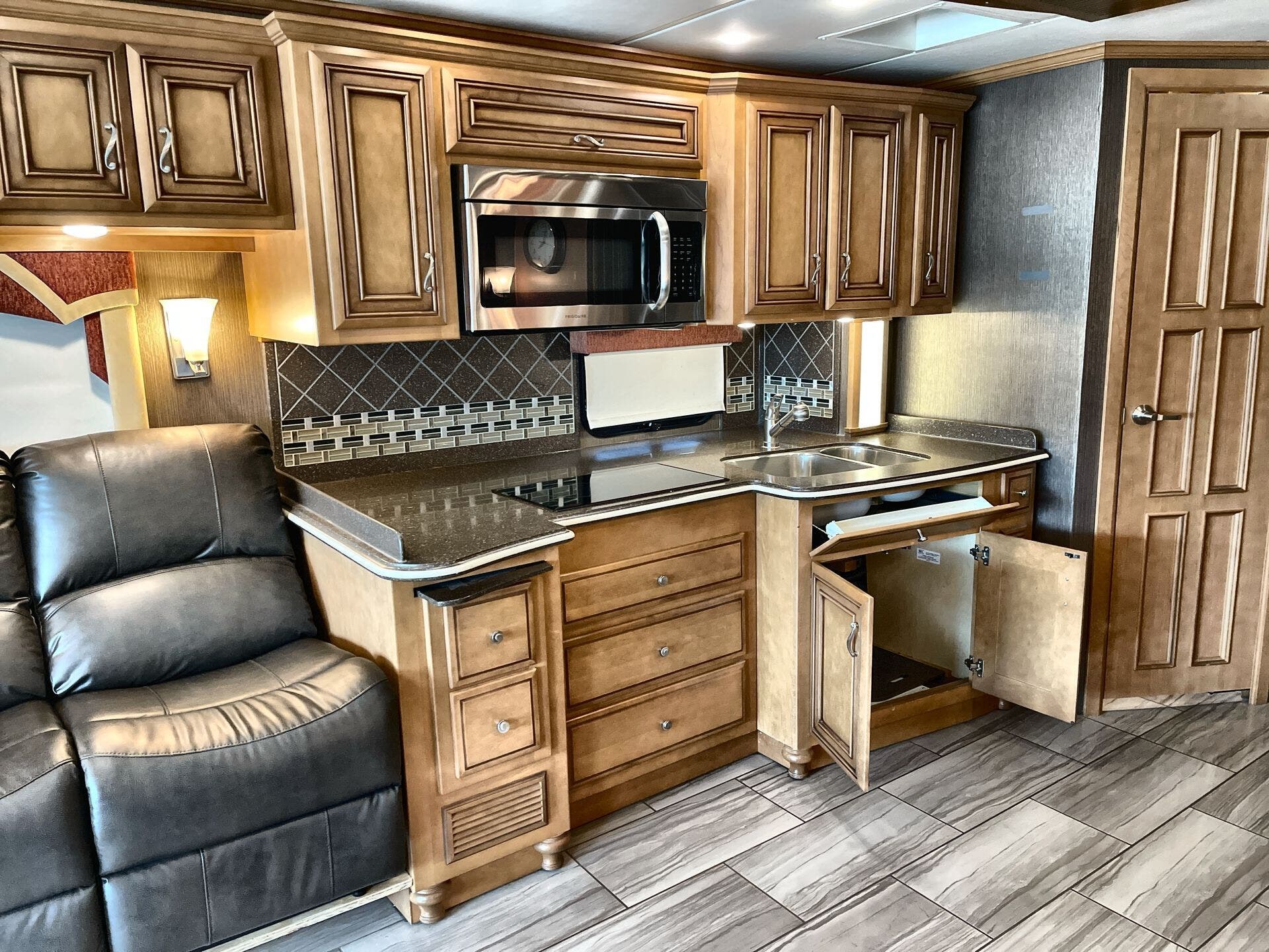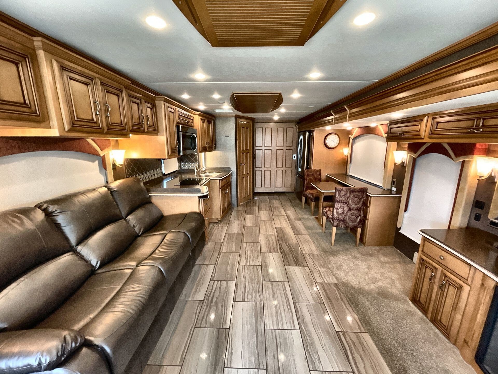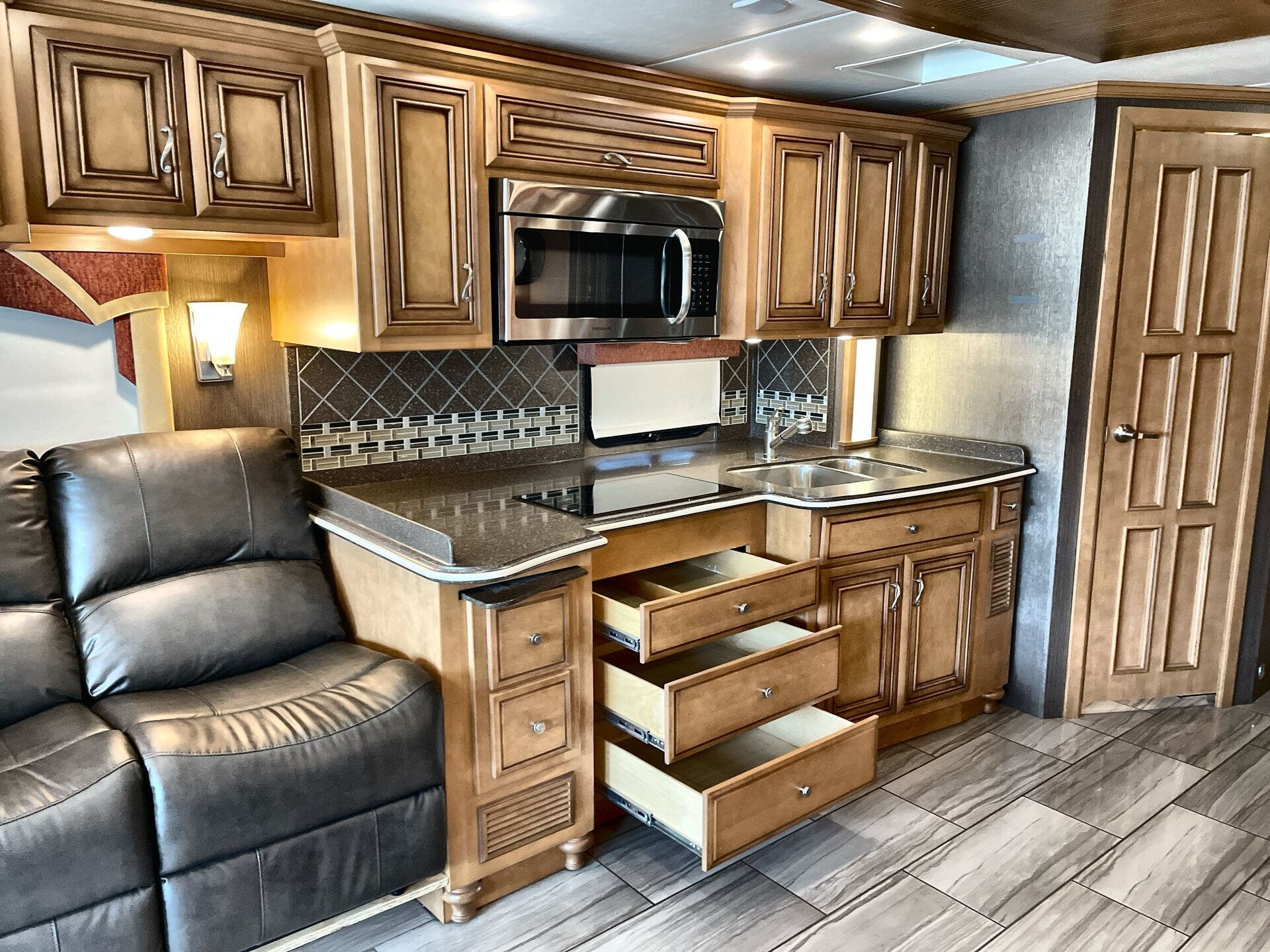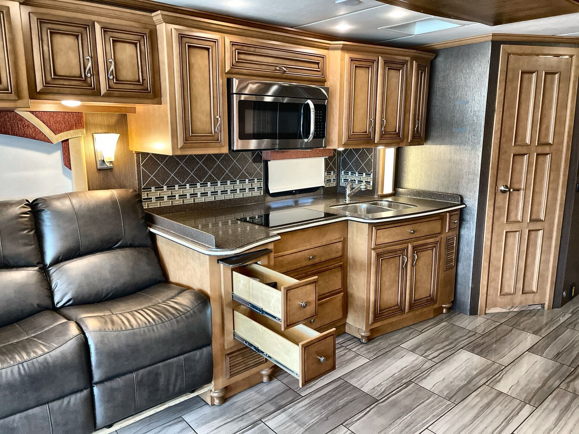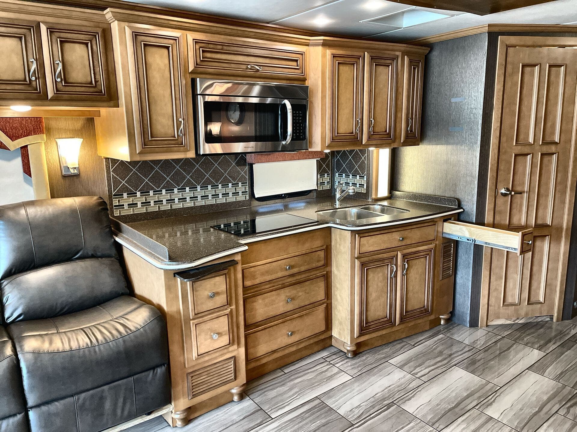 The Ventana offers a versatile floorplan that suits a range of travel needs, featuring Front Entertainment, Mid Bath, Mid Kitchen, Rear Bath, and Rear Bedroom configurations. With three slideouts, the interior feels generous and open, while still providing distinct zones for living, dining, cooking, and sleeping. This layout is ideal for couples or small families seeking a high-end, move-in ready RV experience.