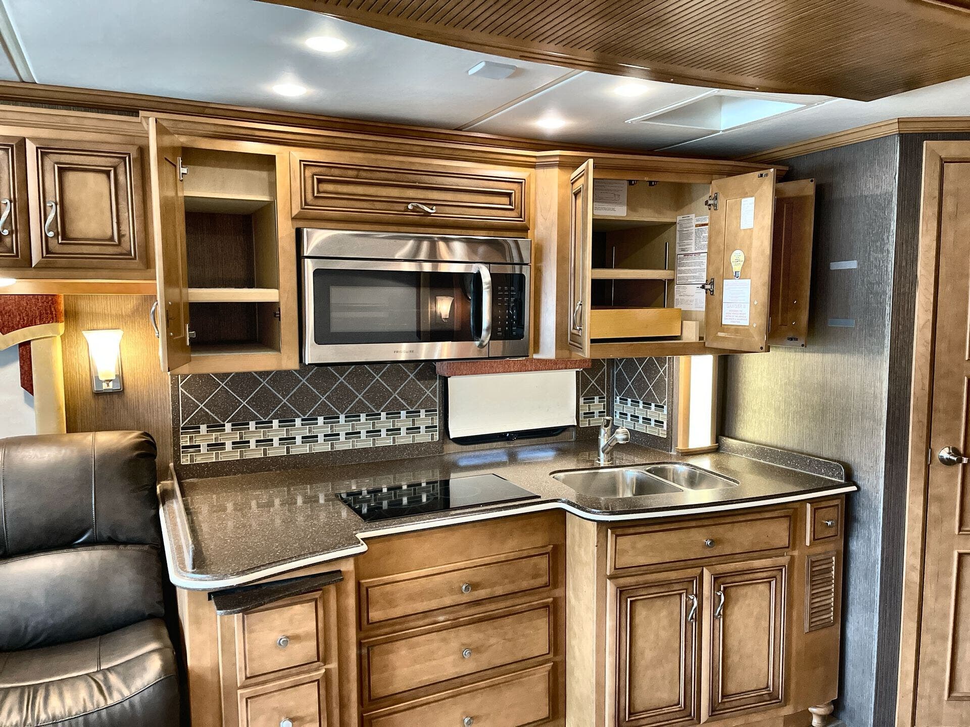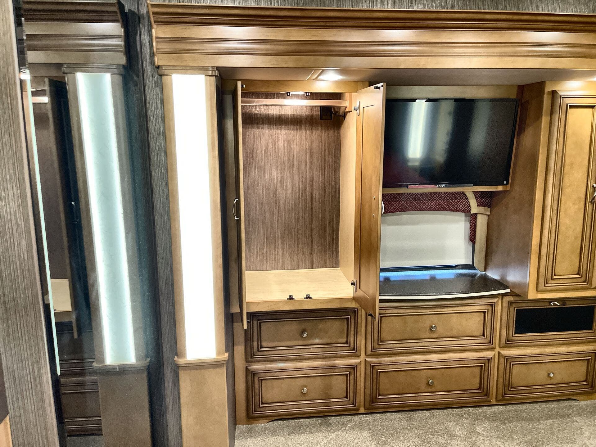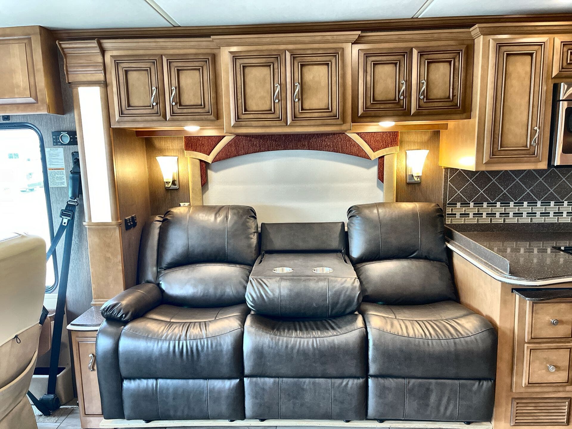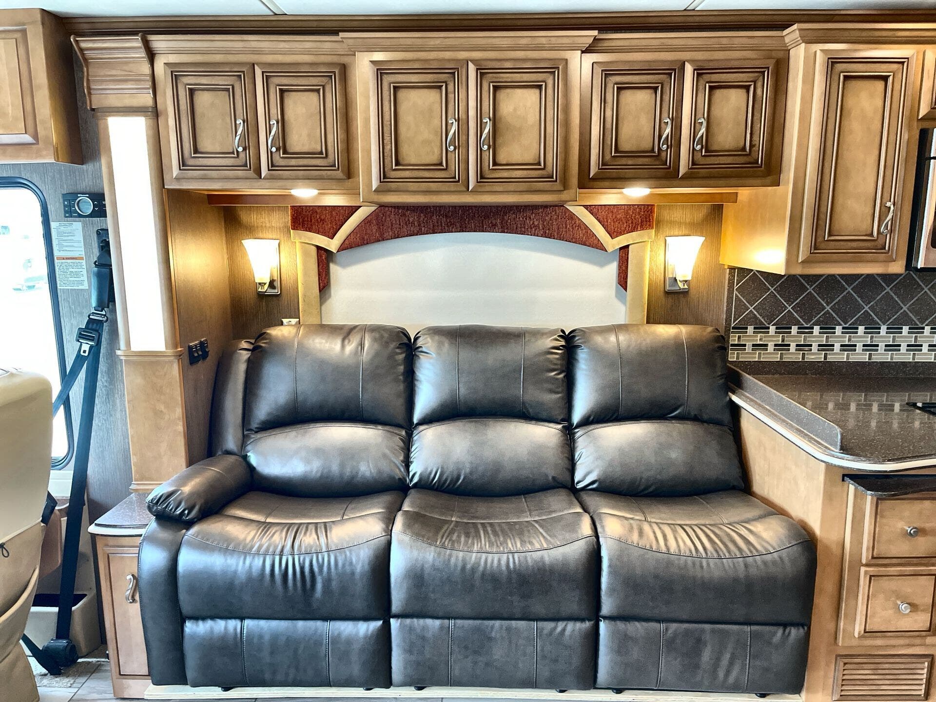 The Ventana offers a versatile floorplan that suits a range of travel needs, featuring Front Entertainment, Mid Bath, Mid Kitchen, Rear Bath, and Rear Bedroom configurations. With three slideouts, the interior feels generous and open, while still providing distinct zones for living, dining, cooking, and sleeping. This layout is ideal for couples or small families seeking a high-end, move-in ready RV experience.