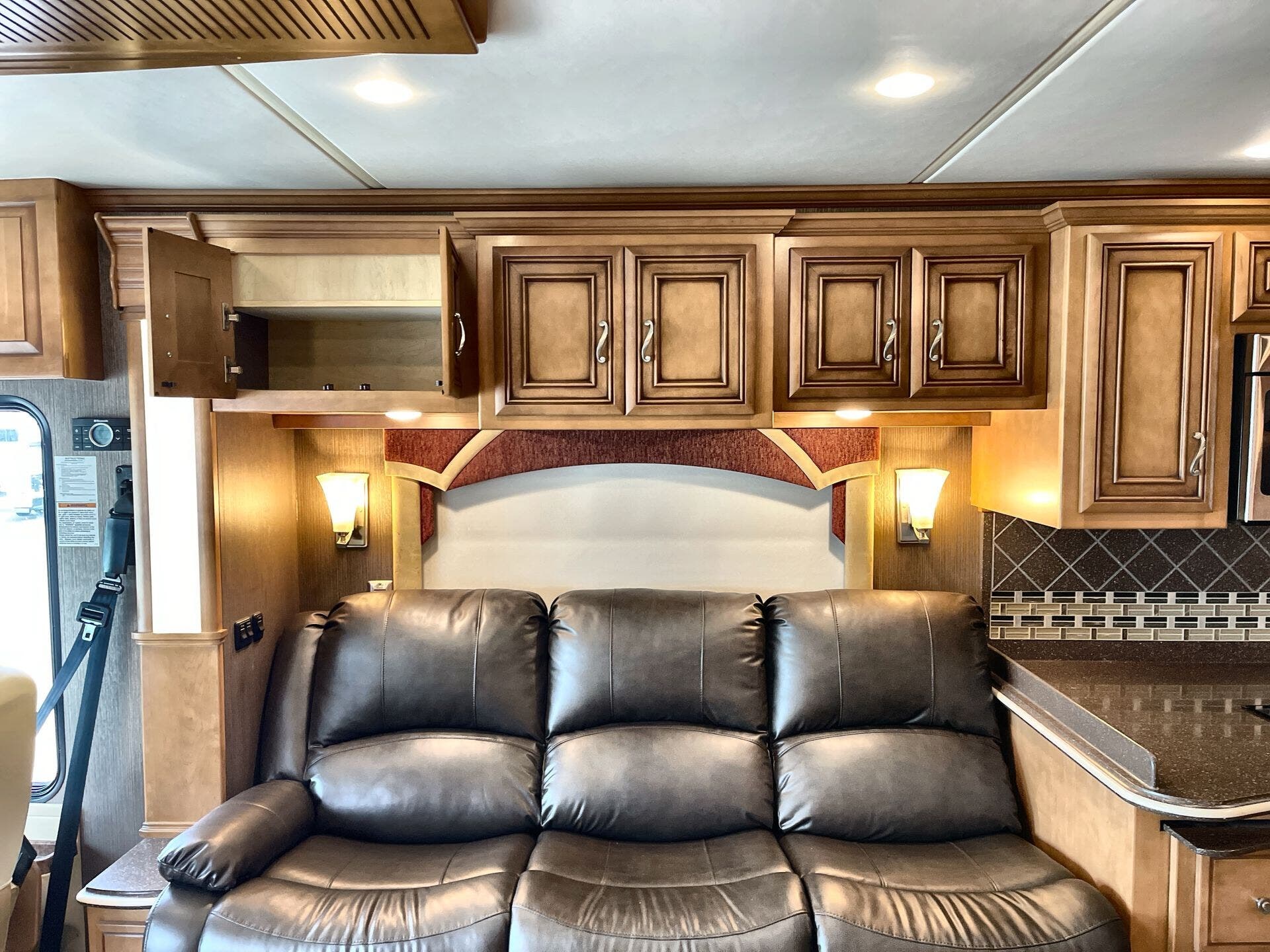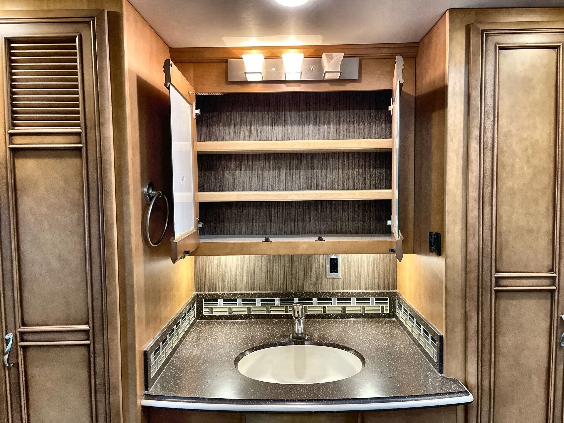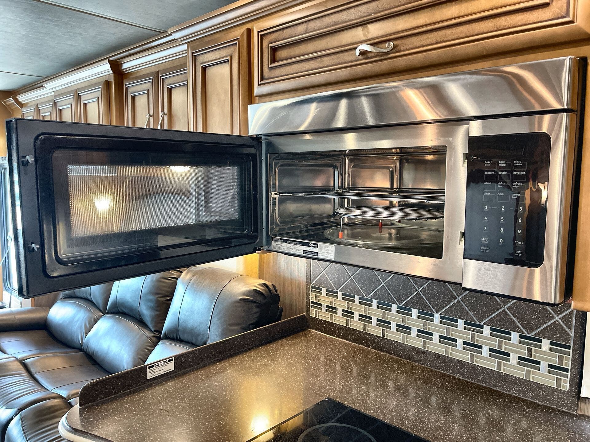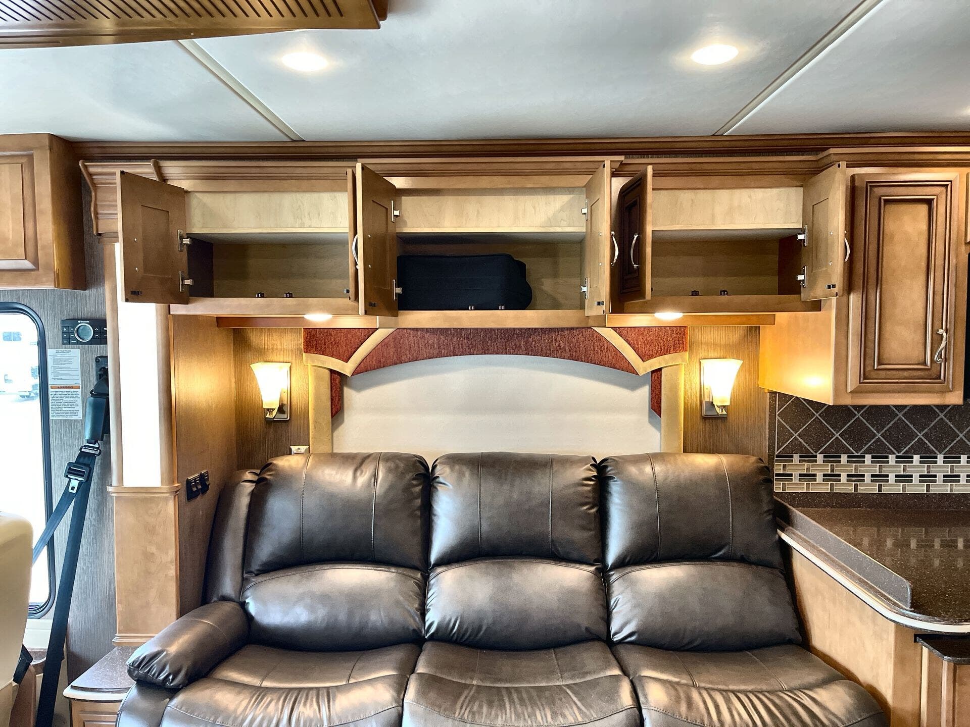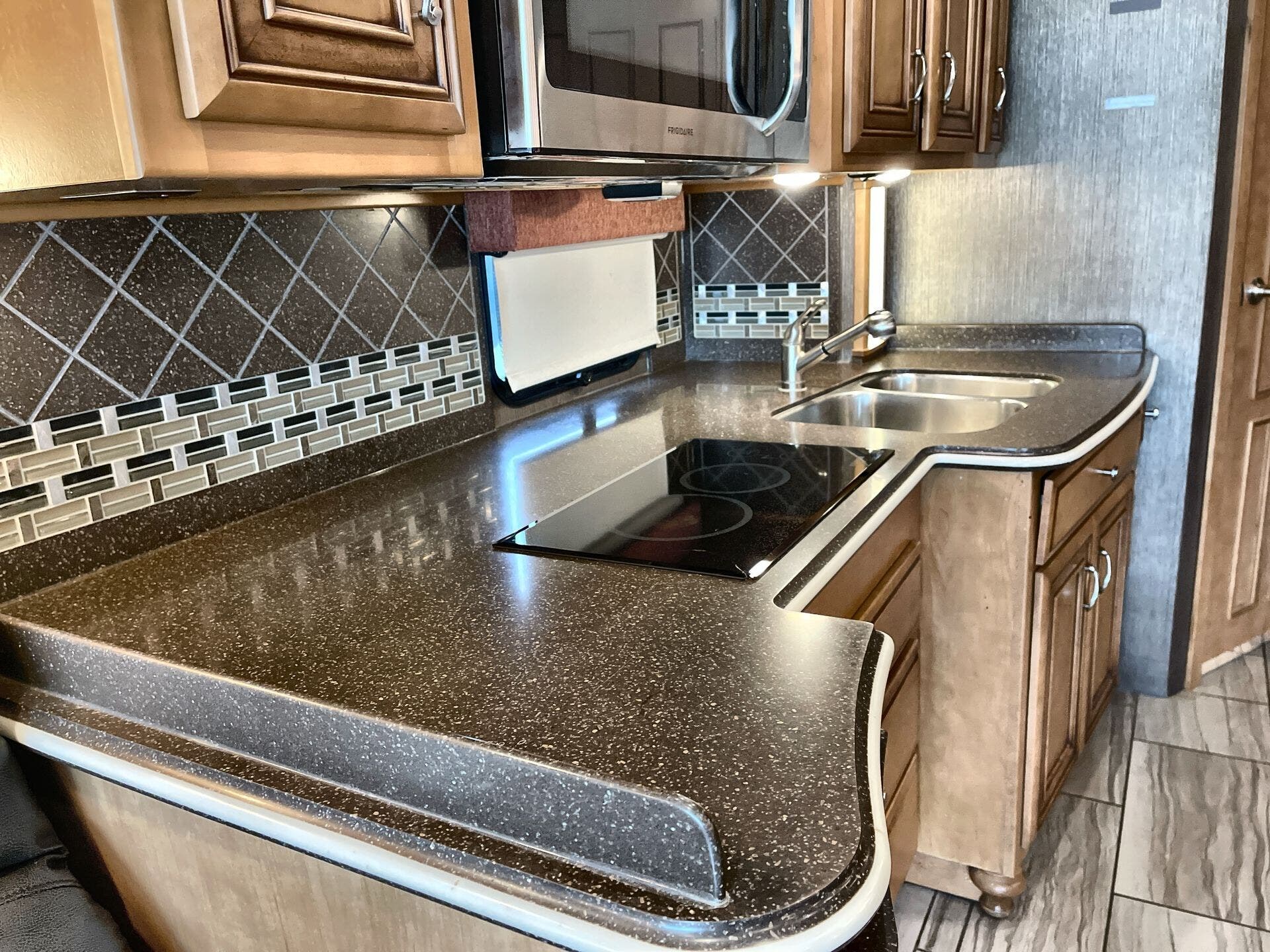 The Ventana offers a versatile floorplan that suits a range of travel needs, featuring Front Entertainment, Mid Bath, Mid Kitchen, Rear Bath, and Rear Bedroom configurations. With three slideouts, the interior feels generous and open, while still providing distinct zones for living, dining, cooking, and sleeping. This layout is ideal for couples or small families seeking a high-end, move-in ready RV experience.