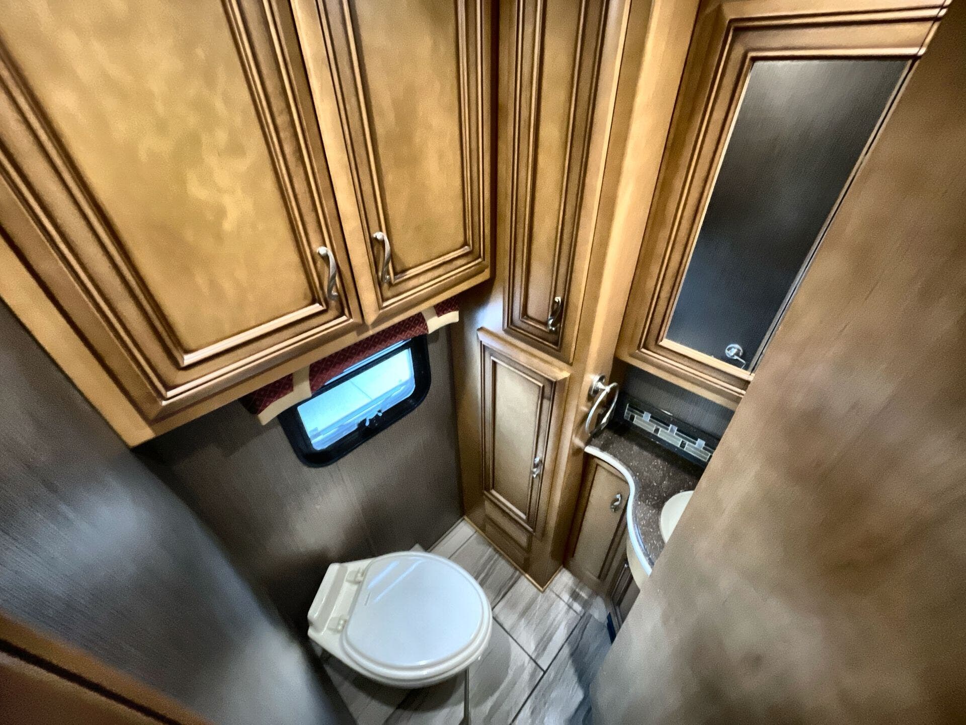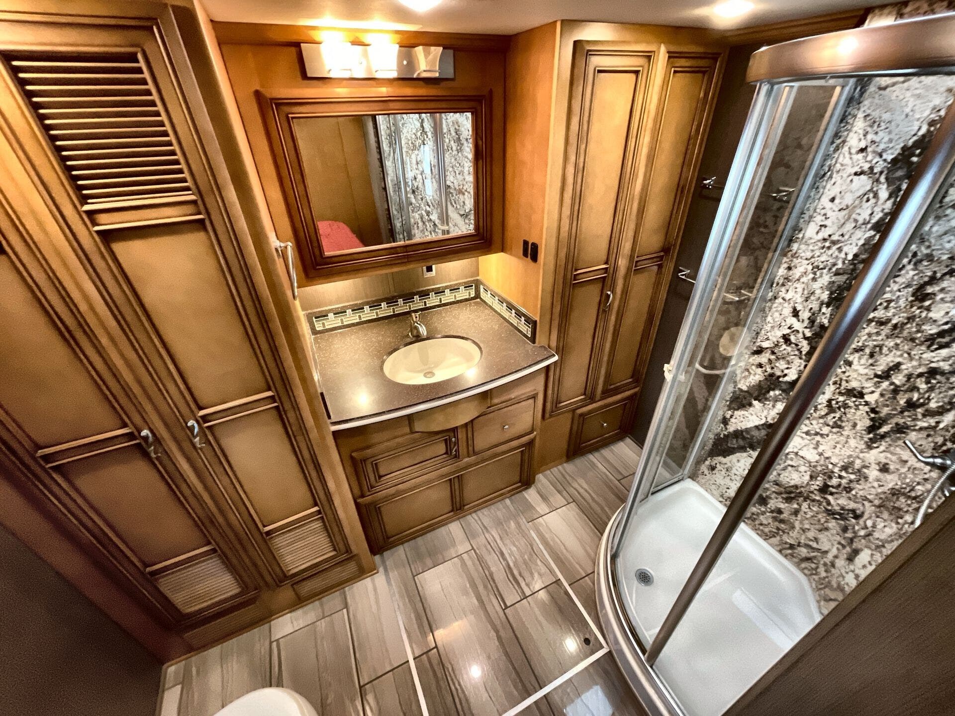 - Shower and toilet with medicine cabinet and overhead cabinetry for daily routines