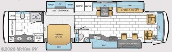 Inside the bedroom you will find a king bed slide. The master bath is quite spacious and has a medicine cabinet, two sinks, adjustable shelves, wardrobe with doors, linen cabinet, toilet, and shower.