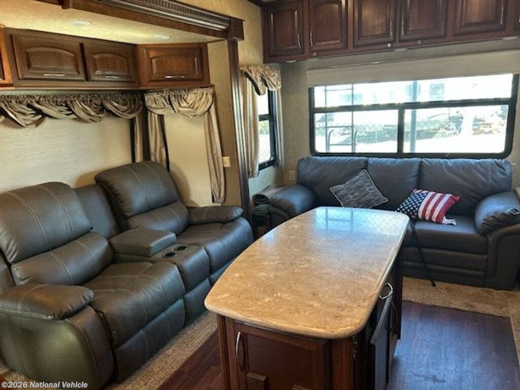 Roomy 37' 5th wheel with 3 slide outs, TrailAir shock hitch, New refrigerator with a full kitchen & center Island, fireplace, CD/DVD player, 2 TVs, Queen size bed with storage underneath, ample closet space with hookups for washer and dryer, full bathroom with spacious shower and 10 gal hot water heater, cable TV and city water hookups, 2 gel-batteries, auto leveling