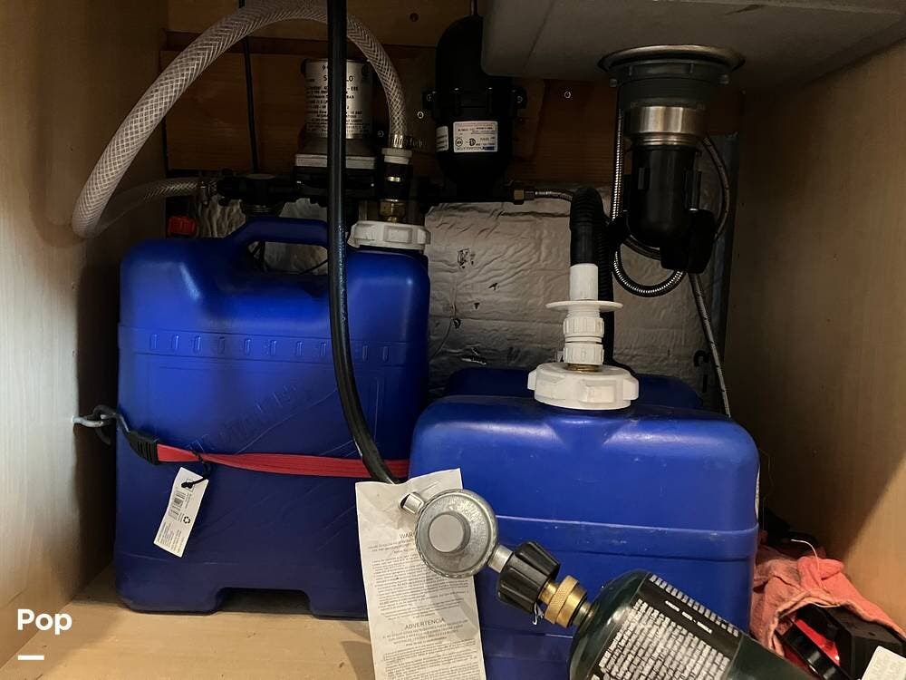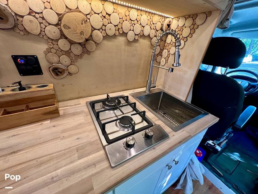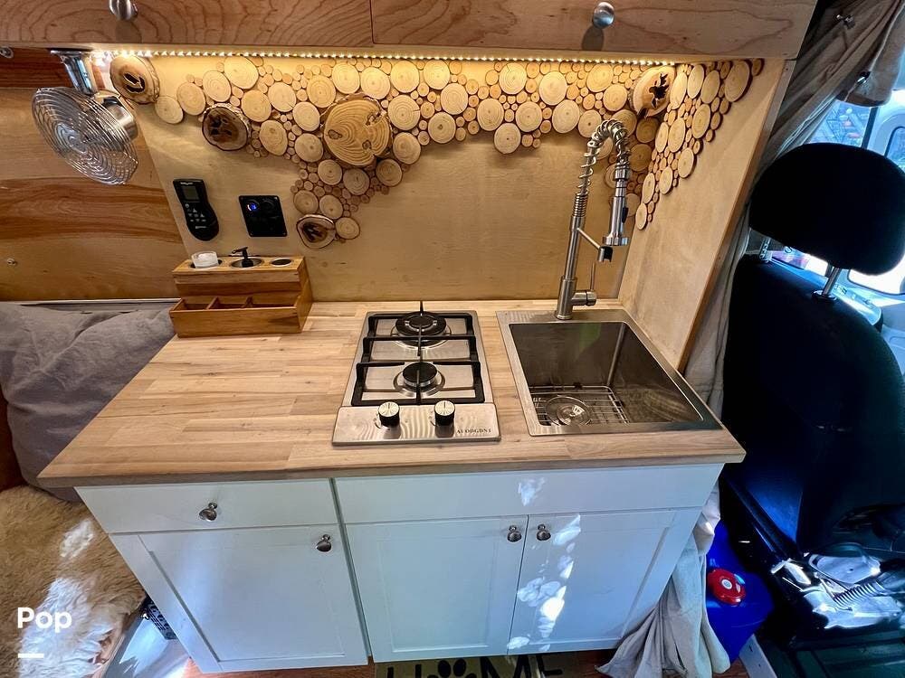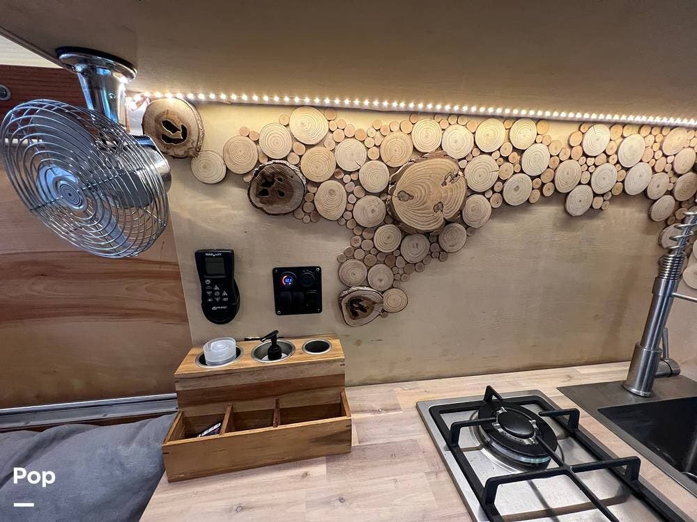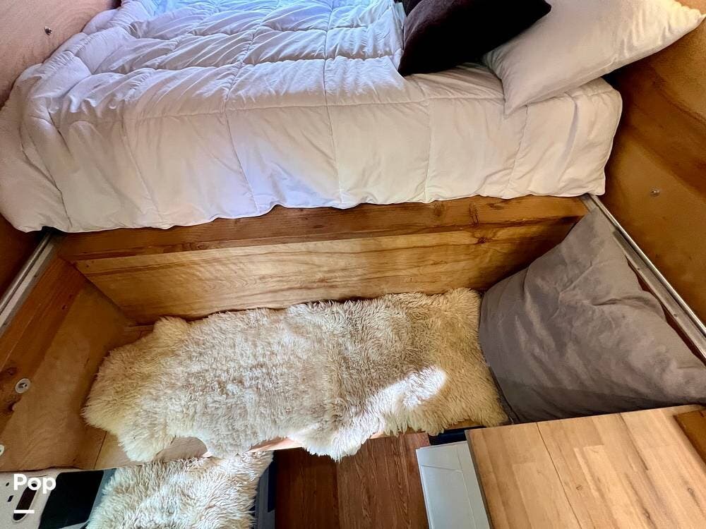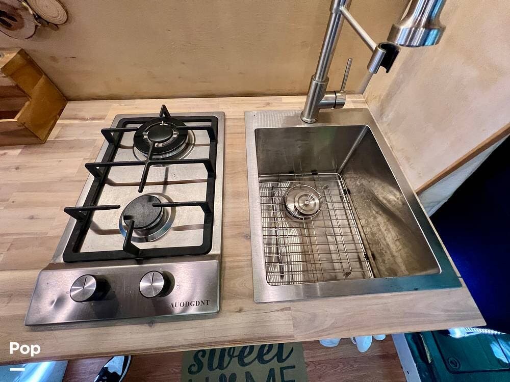 She has tons of storage space under the queen size bed, to make it easy to access the bed is mounted on a slide-rail system that gives access and also expands the storage area. There is plenty of counter space for food prep next to the 2-burner stove top and the sink with a goose-neck faucet.