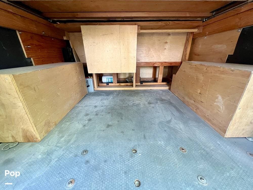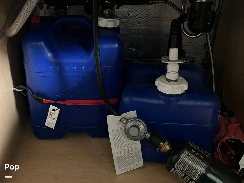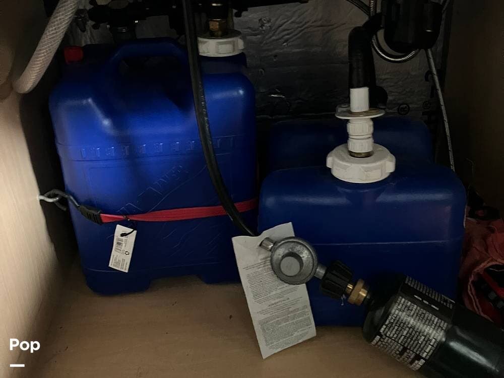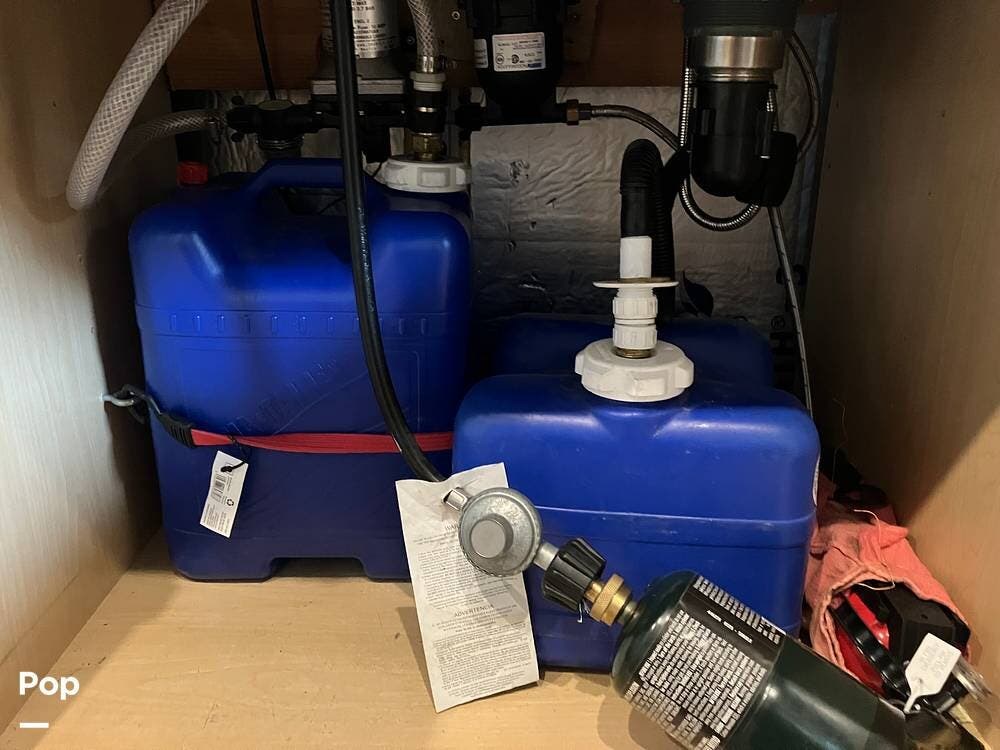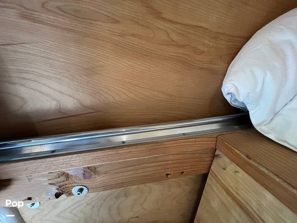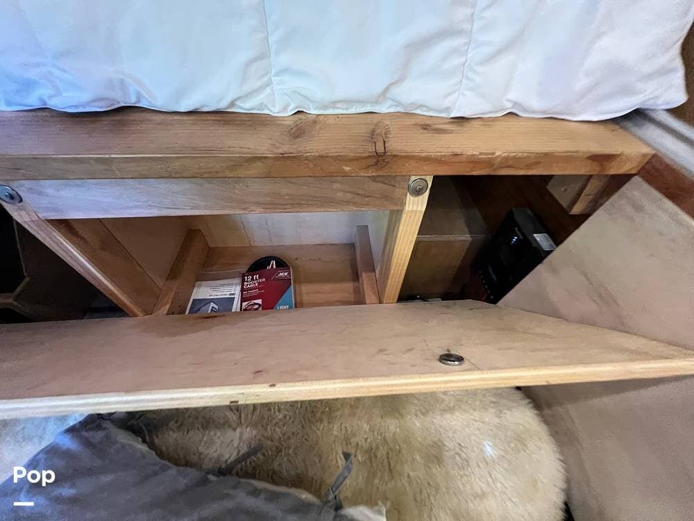 She has tons of storage space under the queen size bed, to make it easy to access the bed is mounted on a slide-rail system that gives access and also expands the storage area. There is plenty of counter space for food prep next to the 2-burner stove top and the sink with a goose-neck faucet.