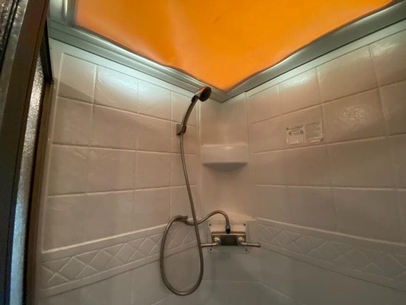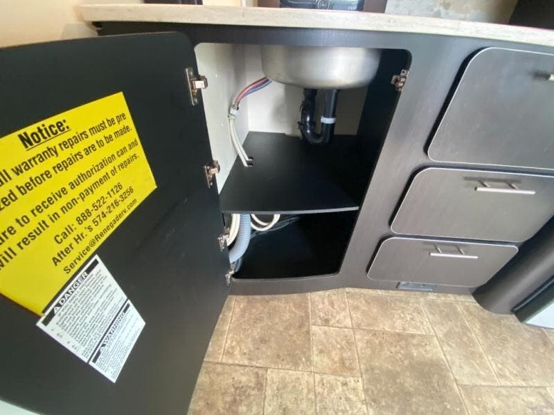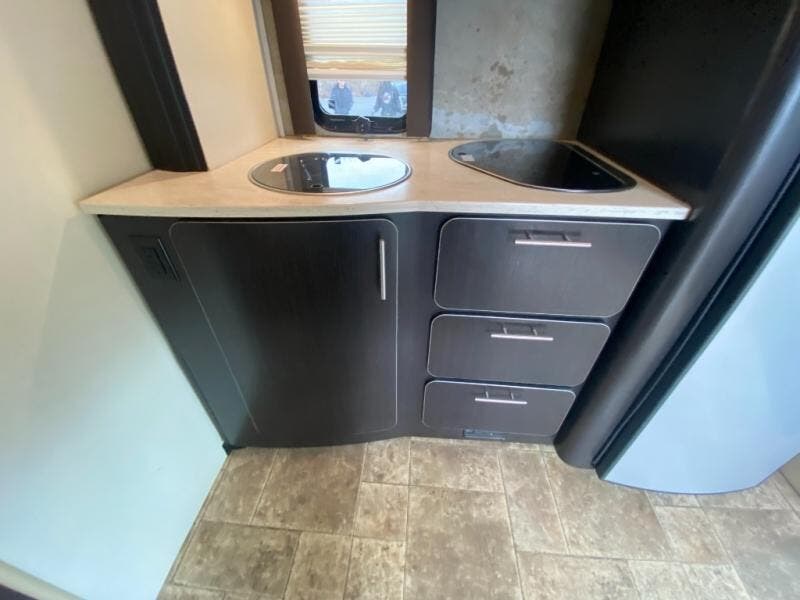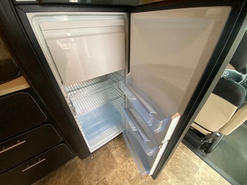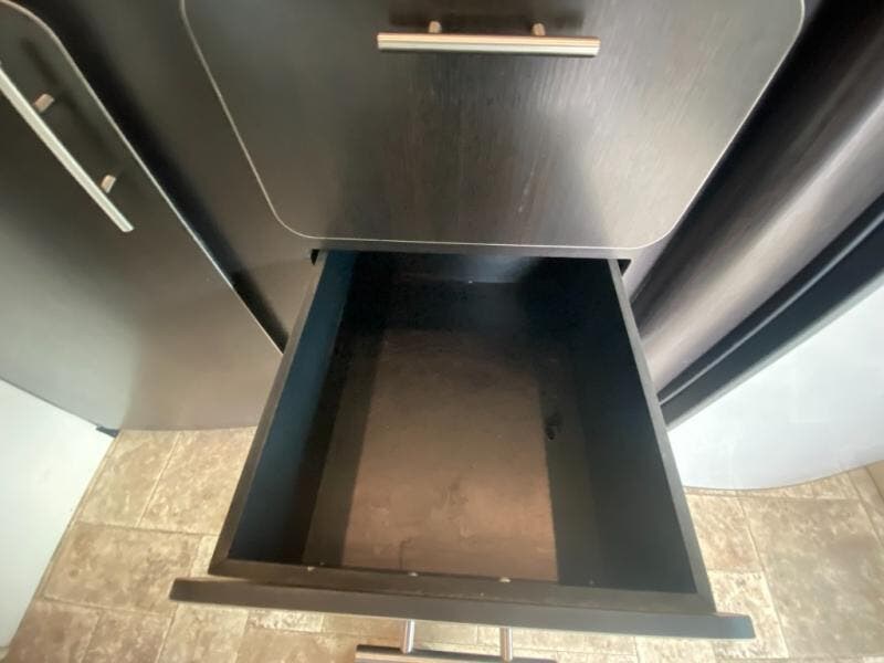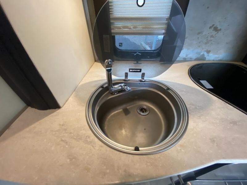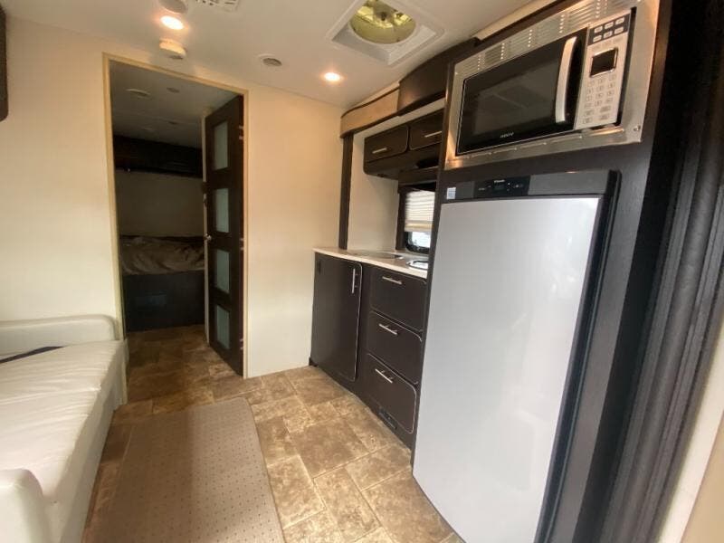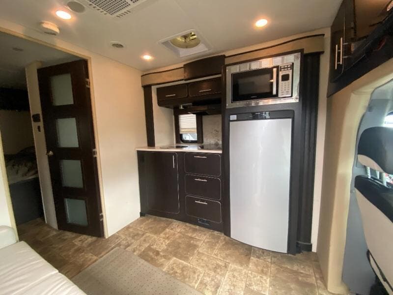 To the left of the door there is a round kitchen sink, counter space, and a refrigerator with microwave oven. A convenient pantry is located along side of the refrigerator for dry good storage, and there are plenty of storage cabinets both above and below the counter for your things.