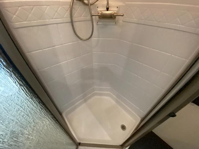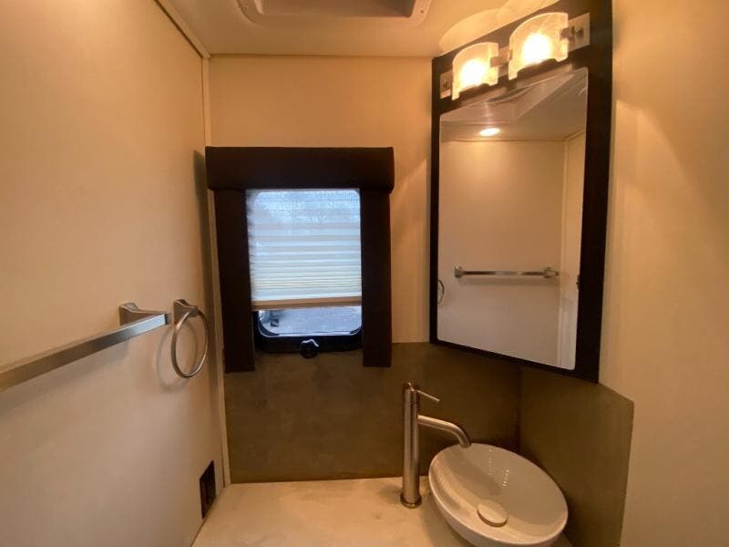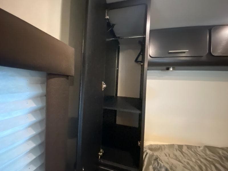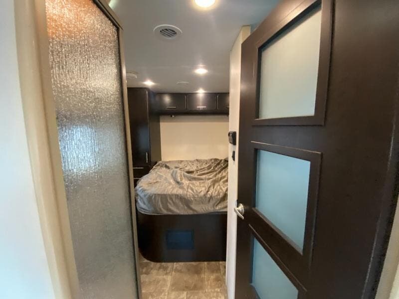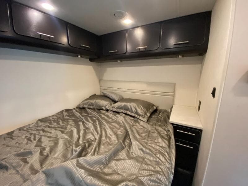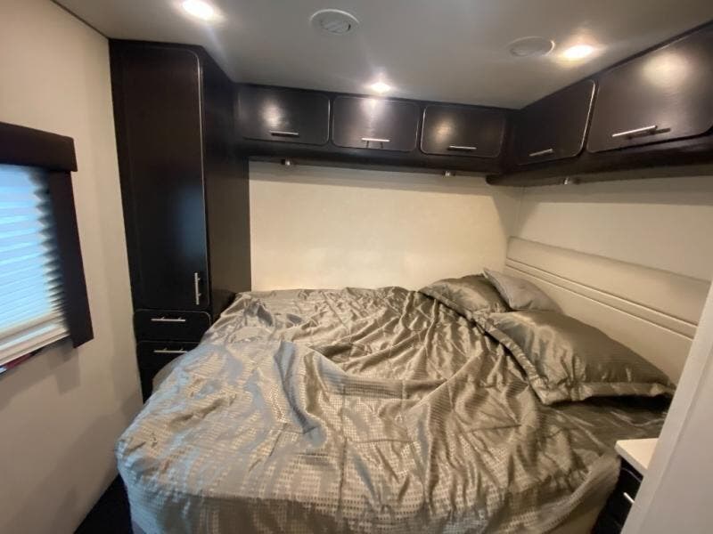 Step up in back to a rear bedroom that slides out. The queen bed is 76" x 60" and features nightstands on either side. There are dual wardrobes just off the foot of the bed on either side, plus so much more!