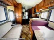 As you enter this class C motor home, a sofa is to your right. A cab over bunk runs across the front, with a 22" LCD TV on the driver's side. Continuing around, a booth dinette with overhead cabinets and the kitchen are along the driver's side. The kitchen includes an angled large bowl kitchen sink, overhead microwave, overhead cabinets and a three burner range. A closet is at the end of the counter. The refrigerator is on the opposite wall.