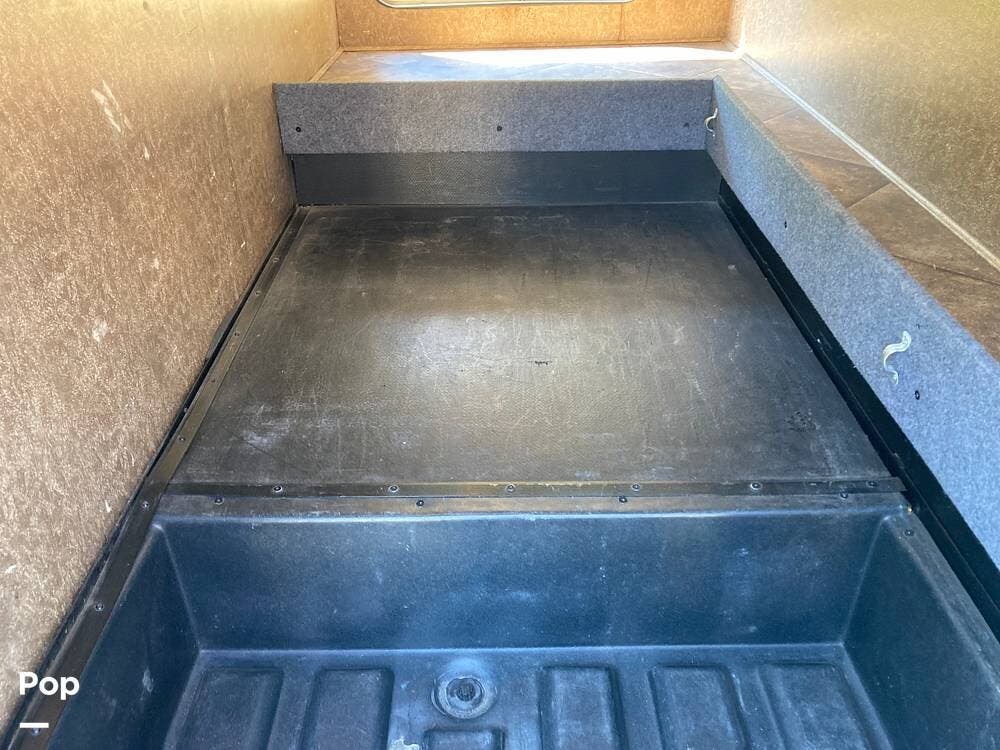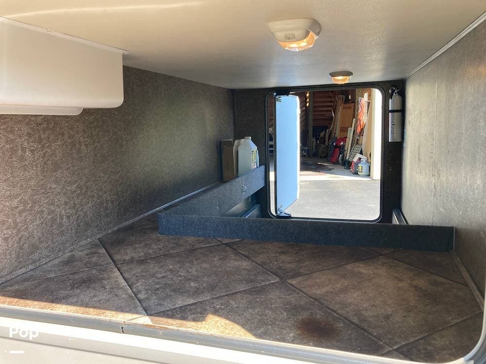 The bedroom has a queen bed with overhead storage and wardrobes for clothes and gear.