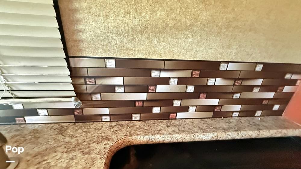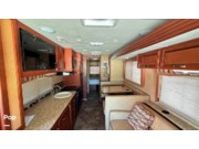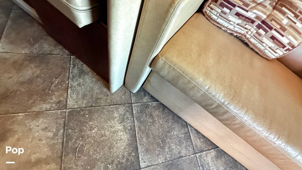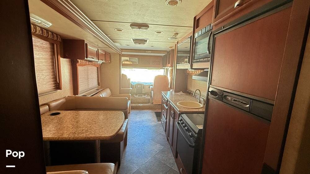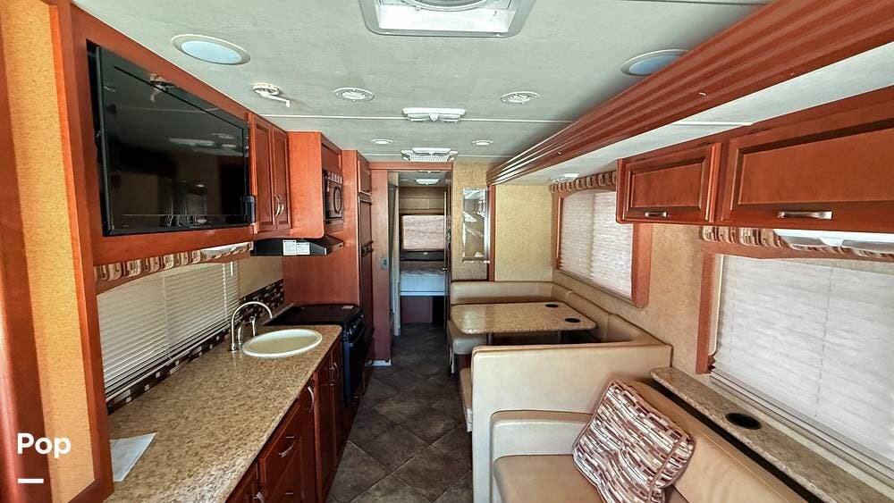 The main living area includes the dinette booth, sleeper sofa, and a large, fully equipped kitchen.