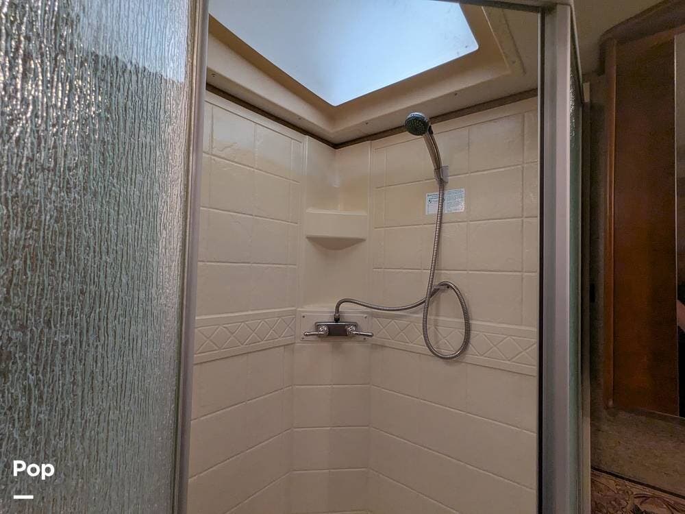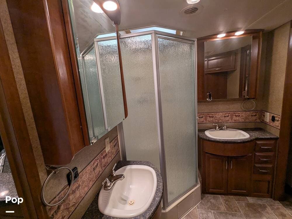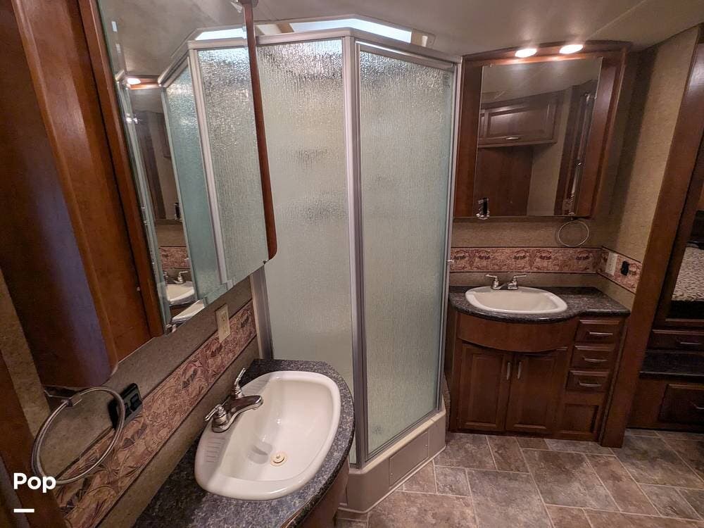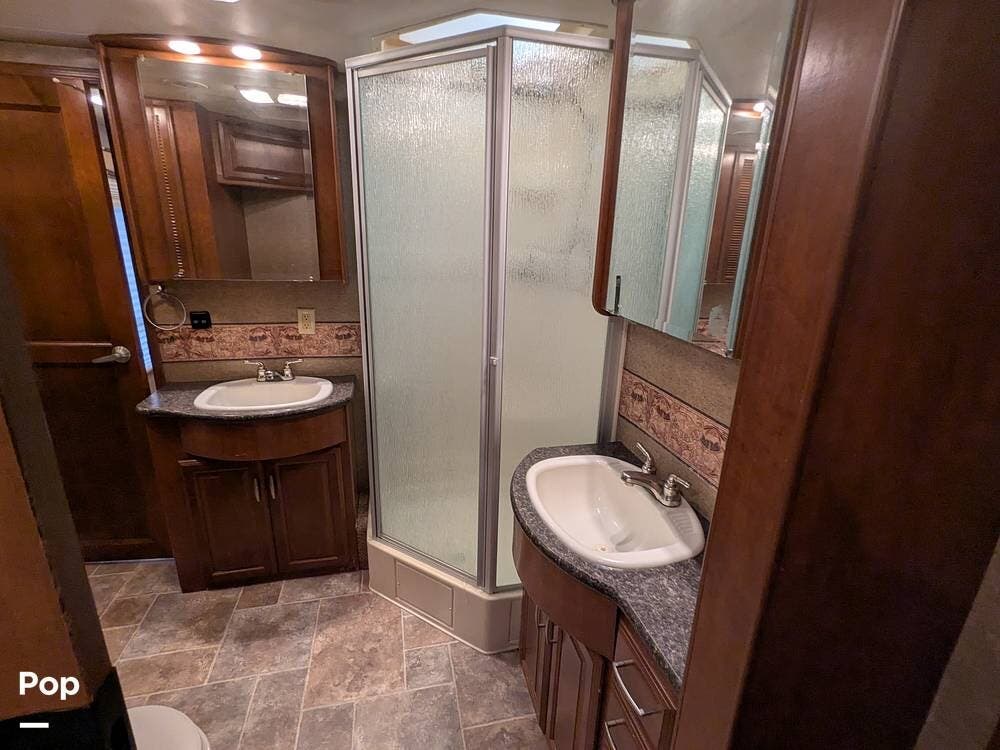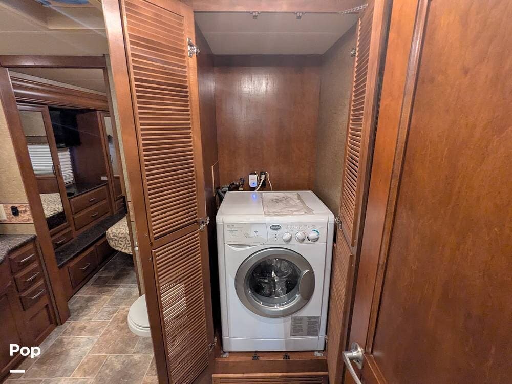 At the rear of the RV, you will find a spacious main bathroom that features two vanities, a large shower, and a washer-dryer. The main bedroom, located behind the bathroom area, is spacious and offers ample storage space.